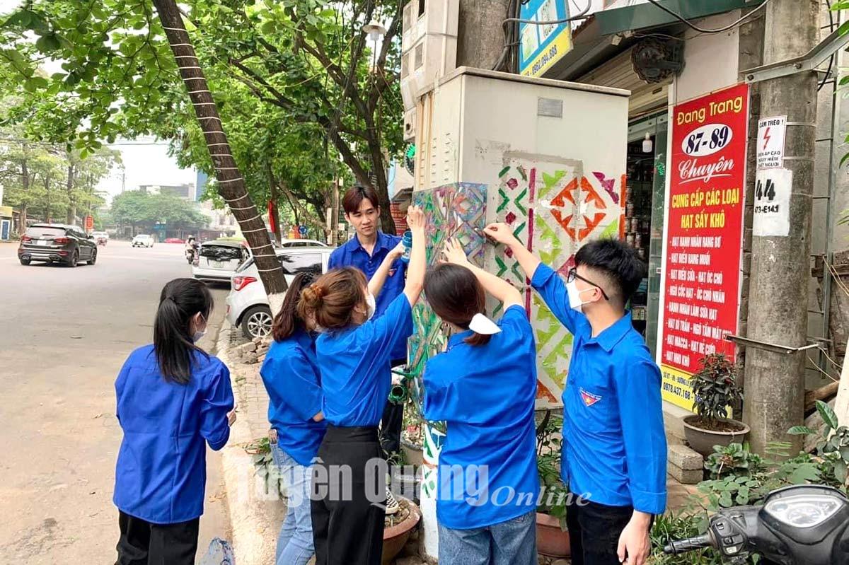 Đoàn viên, thanh niên trên địa bàn thành phố vẽ trang trí cột điện, góp phần tạo cảnh quan môi trường thành phố.
