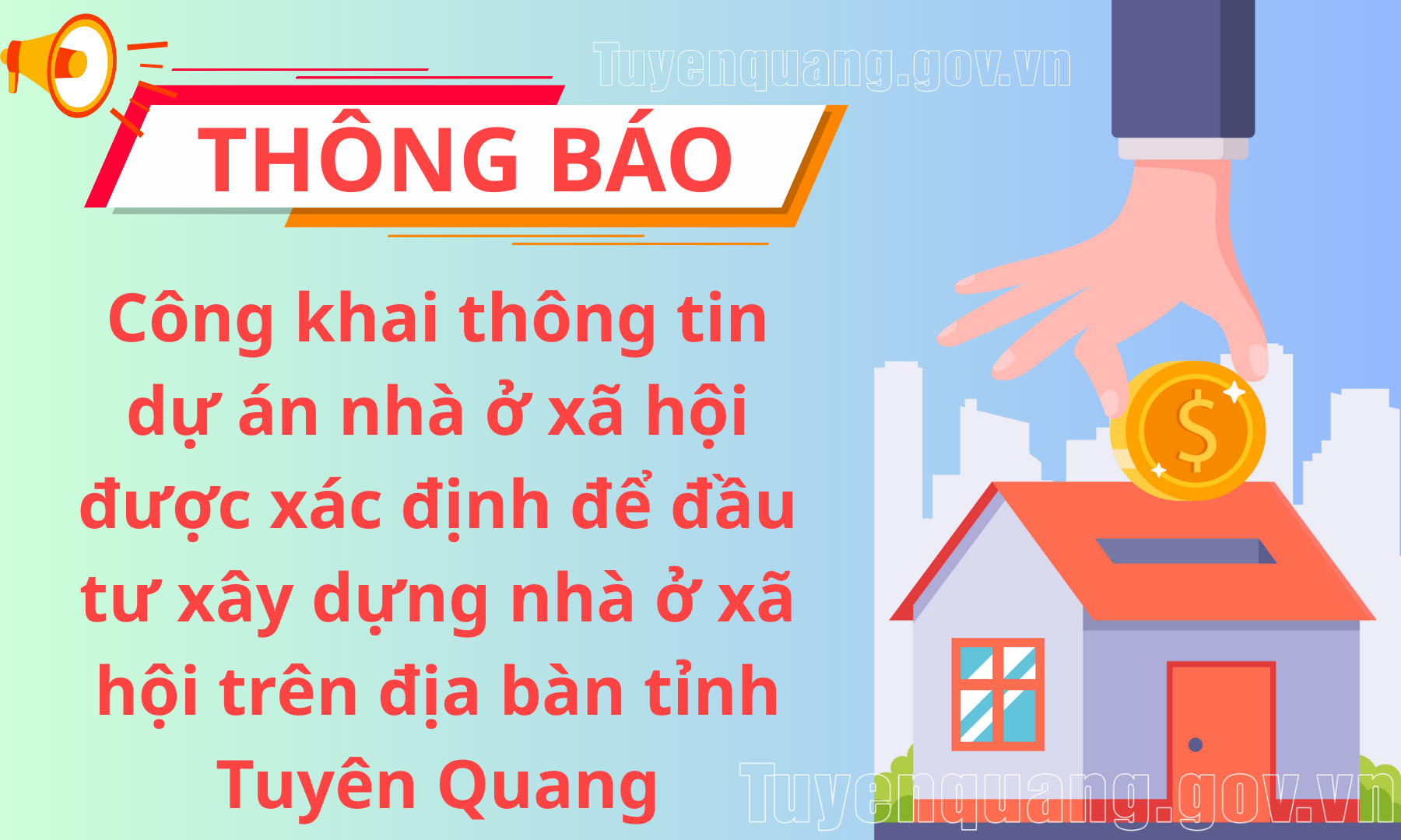 Sở Xây dựng tỉnh Tuyên Quang thông báo công khai Quyết định chấp thuận chủ trương đầu tư dự án Khu nhà ở xã hội tại phường Ỷ La thuộc quy hoạch Khu dân cư Tân Phát, phường Ý La, thành phố Tuyên Quang (nay là phường Minh Xuân, tỉnh Tuyên Quang). Sở Xây dựng đề nghị các nhà đầu tư quan tâm, đăng ký làm chủ đầu tư dự án theo quy định pháp luật.