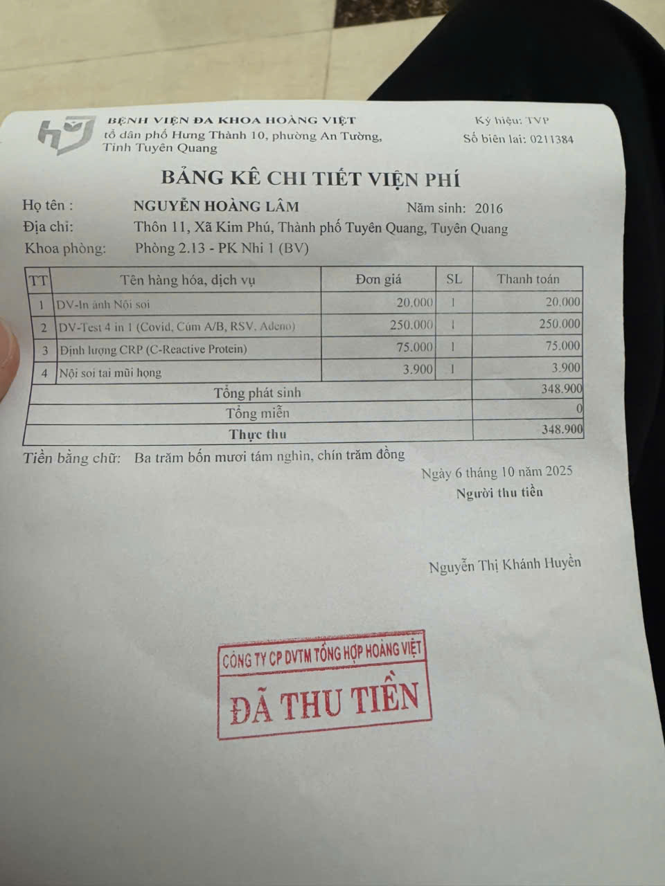 Nội dung bạn phản ánh liên quan đến việc thu thêm 23.900 đồng tiền in ảnh nội soi Tai Mũi Họng tại Bệnh viện Hoàng Việt (phường Minh Xuân, tỉnh Tuyên Quang) khi thực hiện dịch vụ có sử dụng bảo hiểm y tế (BHYT). Về vấn đề này, để được xem xét, kiểm tra và trả lời chính xác, đề nghị bạn liên hệ trực tiếp với Sở Y tế tỉnh Tuyên Quang - cơ quan quản lý nhà nước về lĩnh vực y tế trên địa bàn.