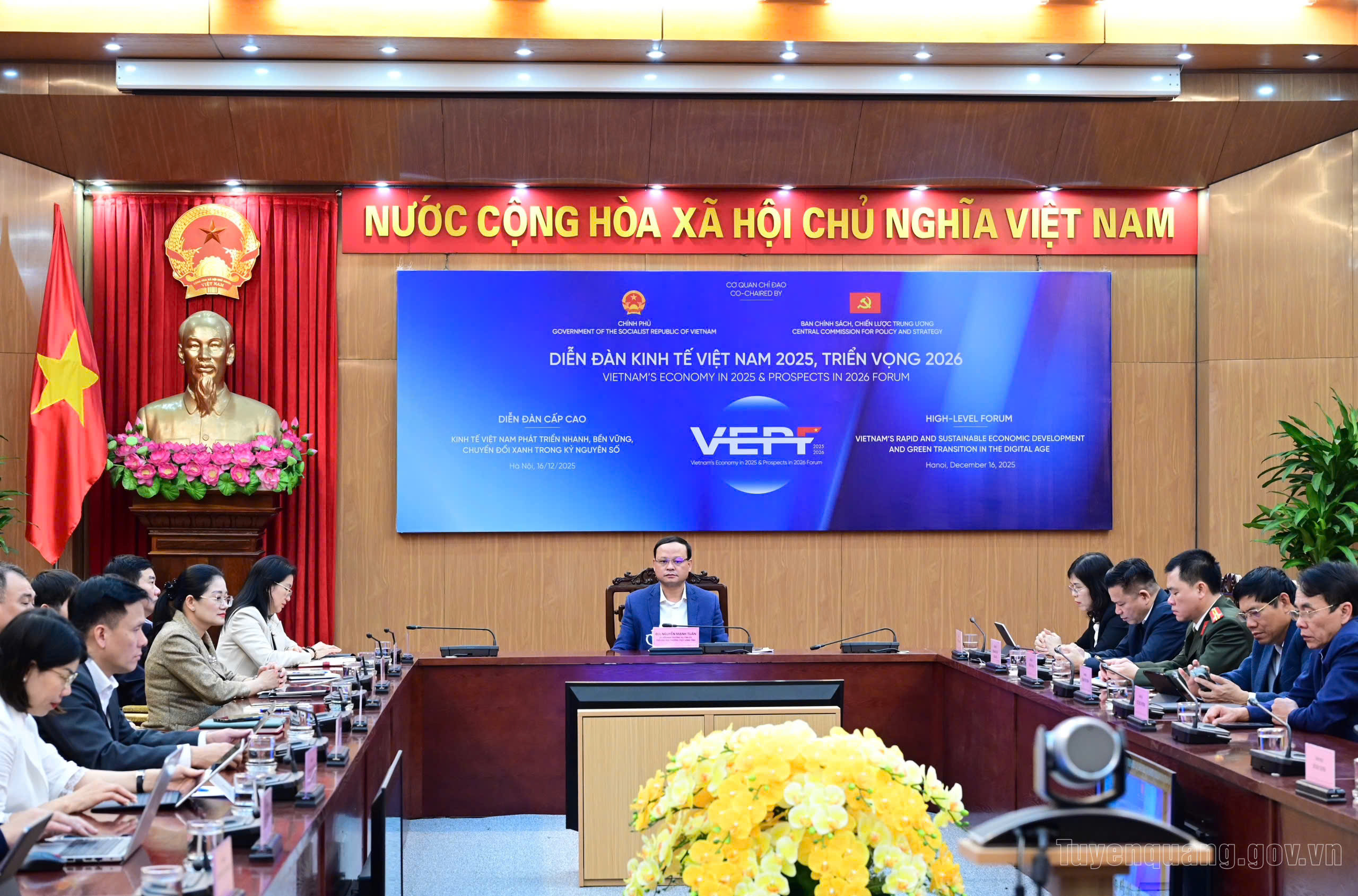 Chiều 16/12, tại Hà Nội, Phiên toàn thể Diễn đàn Kinh tế Việt Nam 2025, triển vọng 2026 (VEPF) đã chính thức diễn ra với chủ đề "Kinh tế Việt Nam phát triển nhanh, bền vững, chuyển đổi xanh trong kỷ nguyên số." Thủ tướng Chính phủ Phạm Minh Chính, Phó Chủ tịch Quốc hội Vũ Hồng Thanh, Trưởng Ban Chính sách, chiến lược Trung ương Nguyễn Thanh Nghị đồng chủ trì.
