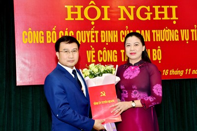 Ban Thường vụ Tỉnh ủy quyết định điều động đồng chí Phạm Mạnh Duyệt, Tỉnh ủy viên, Phó Chủ nhiệm Thường trực Ủy ban Kiểm tra Tỉnh ủy thôi giữ chức vụ Phó Chủ nhiệm Thường trực Ủy ban Kiểm tra Tỉnh ủy nhận nhiệm vụ Giám đốc Sở Tài nguyên và Môi trường; đồng chí Đào Thị Mai, Phó Chánh Văn phòng Tỉnh ủy thôi giữ chức vụ Phó Chánh Văn phòng Tỉnh ủy nhận nhiệm vụ Chủ tịch Hội Nông dân tỉnh.