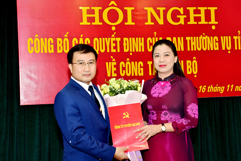 Đồng chí Phó Bí thư Thường trực Tỉnh ủy Lê Thị Kim Dung trao Quyết định cho đồng chí Đào Thị Mai.