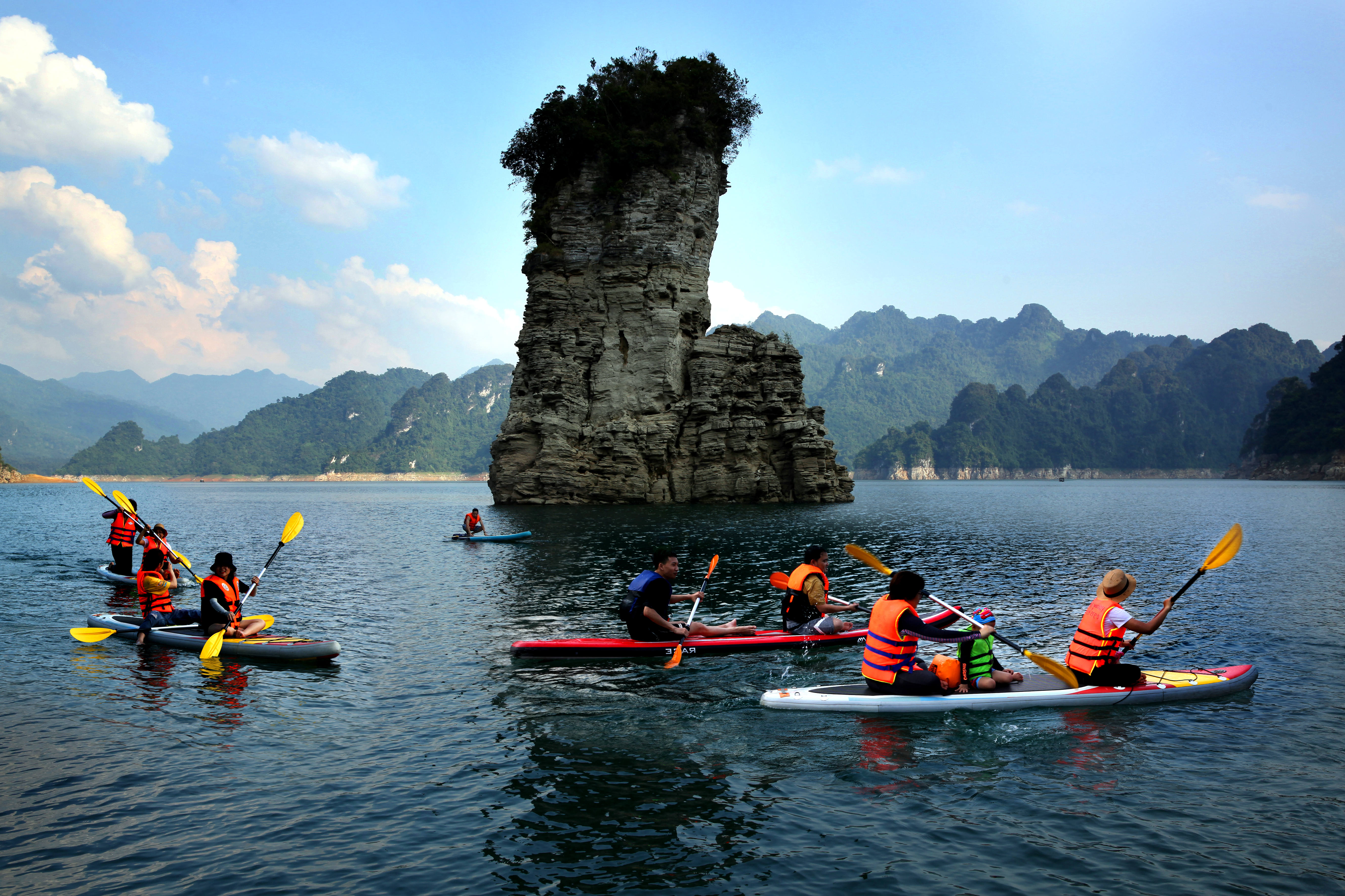 Thời điểm này, du khách đang nườm nượp đổ xô đến Hồ sinh thái Na Hang - Lâm Bình (Tuyên Quang) du ngoạn cảnh sắc tuyệt đẹp bằng thuyền kayak, hay chèo SUP. Lòng hồ với những thắng cảnh đẹp nổi tiếng như Cọc Vài phạ, thác Khuổi Nhi, Khuổi Súng, động Song Long…