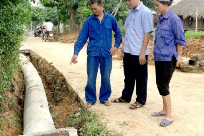 (đứng giữa) kiểm tra tiến độ thực hiện kiên cố hệ thống cống rãnh thoát nước tại thôn Chè 8.