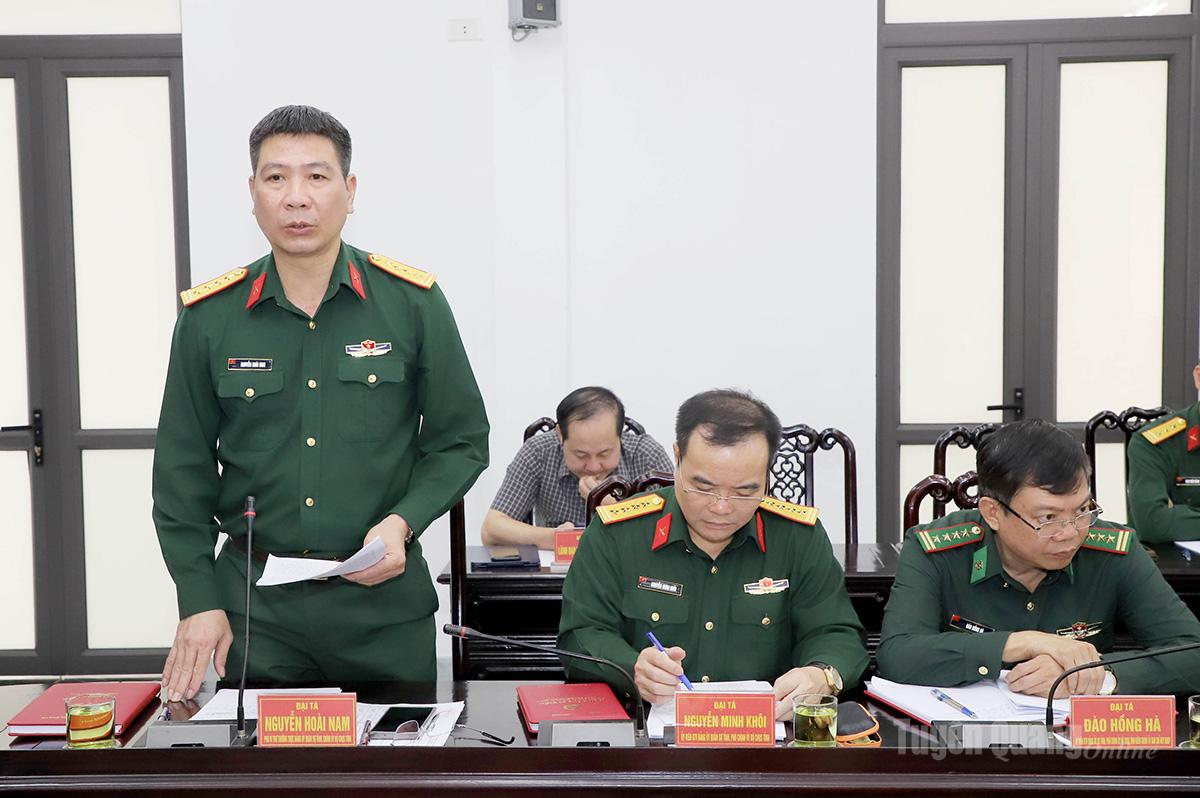 Đại tá Nguyễn Hoài Nam, Phó Bí thư Thường trực Đảng ủy Quân sự tỉnh báo cáo tại hội nghị.