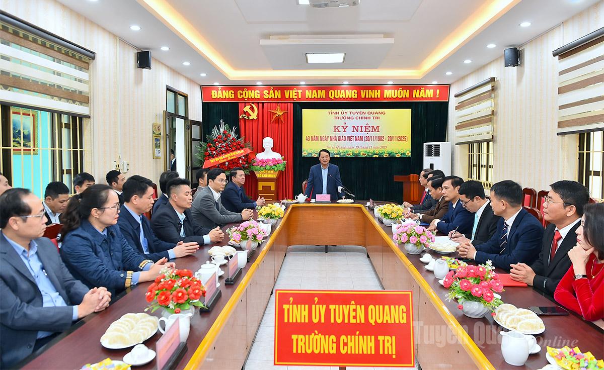 Thay mặt tập thể nhà trường, lãnh đạo Trường Chính trị tỉnh bày tỏ sự trân trọng cảm ơn sự quan tâm sâu sắc của Thường trực Tỉnh ủy và cá nhân đồng chí Bí thư Tỉnh uỷ, đặc biệt là những chỉ đạo quan trọng trong buổi làm việc đầu tháng 11/2025 về đào tạo, bồi dưỡng cán bộ; nghiên cứu khoa học lý luận chính trị; xây dựng đội ngũ giảng viên và đầu tư xây dựng cơ sở vật chất của trường.