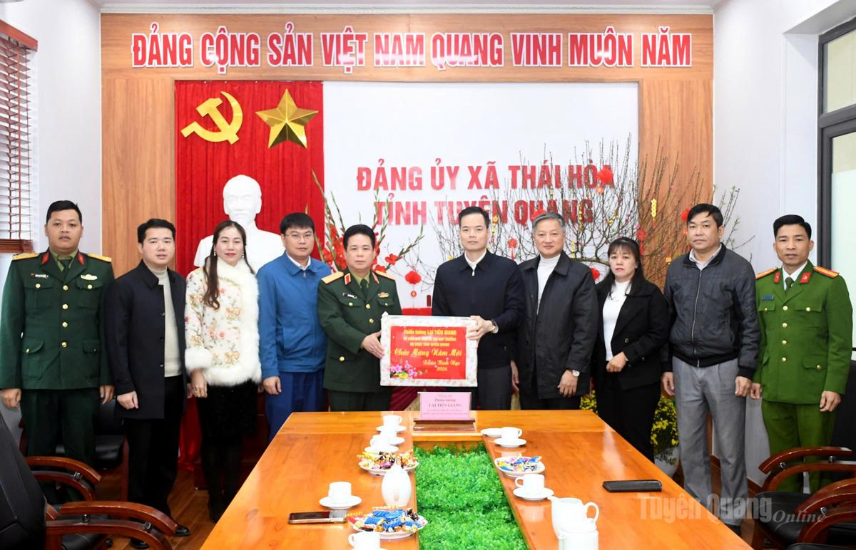 Đồng chí Lại Tiến Giang đã ân cần thăm hỏi, gửi lời chúc mừng năm mới tới tập thể lãnh đạo, cán bộ, công chức và Nhân dân xã Thái Hòa; ghi nhận, đánh giá cao những kết quả mà địa phương đạt được trong phát triển kinh tế - xã hội, quốc phòng - an ninh trong thời gian qua. Đồng chí đề nghị xã tiếp tục phát huy tinh thần đoàn kết, tập trung thực hiện tốt các nhiệm vụ trọng tâm trong năm mới, chăm lo Tết cho người dân và chuẩn bị tốt các điều kiện cho cuộc bầu cử đại biểu Quốc hội và HĐND các cấp diễn ra thành công tốt đẹp.