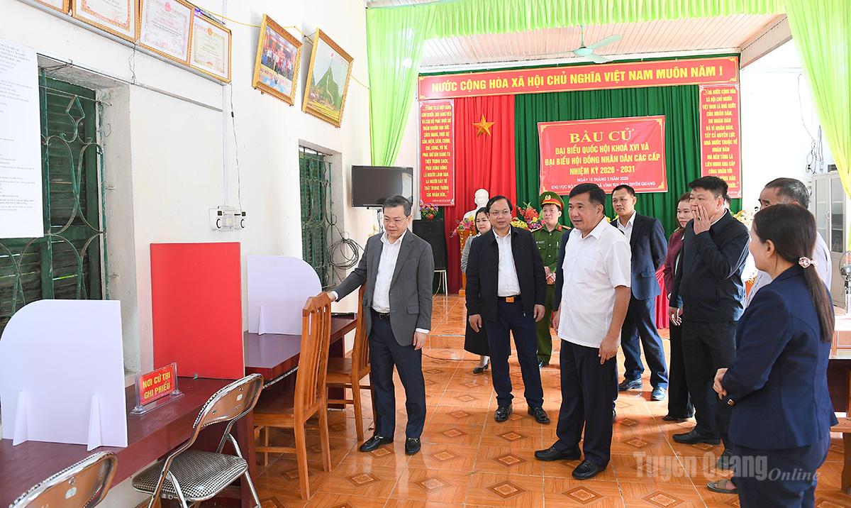 Chủ tịch HĐND tỉnh Nguyễn Văn Sơn và đoàn công tác kiểm tra khu vực ghi phiếu của cử tri tại khu vực bỏ phiếu thôn Tân Lập, xã Vĩnh Tuy.