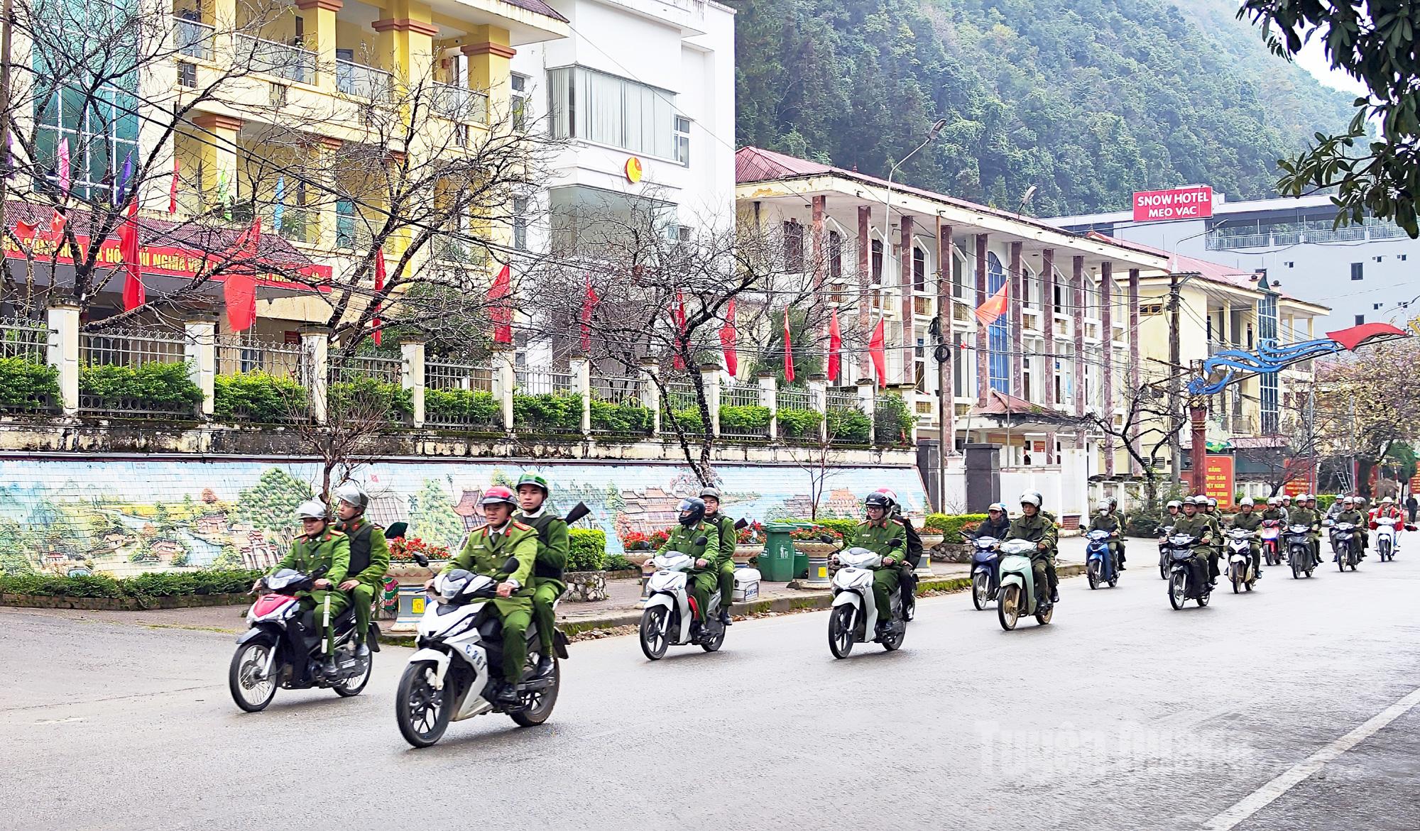 Công an xã Mèo Vạc diễu hành trên các tuyến đường.