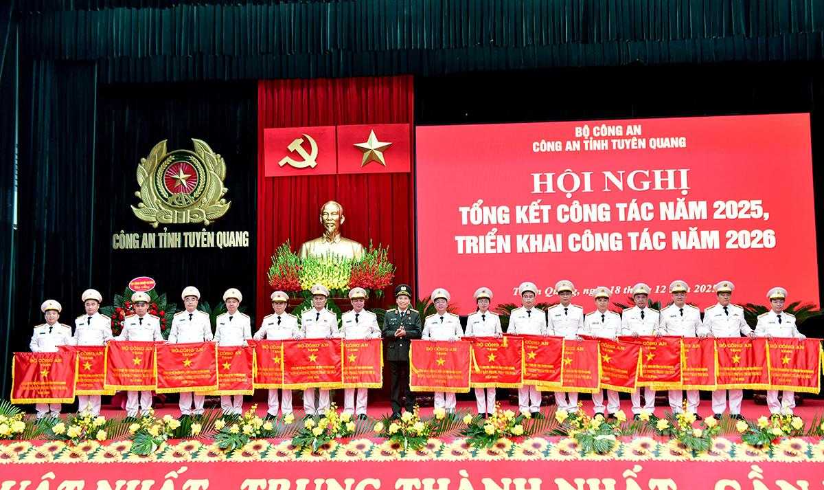 Thứ trưởng Bộ Công an Lê Văn Tuyến trao Cờ thi đua của Bộ Công an cho các tập thể.