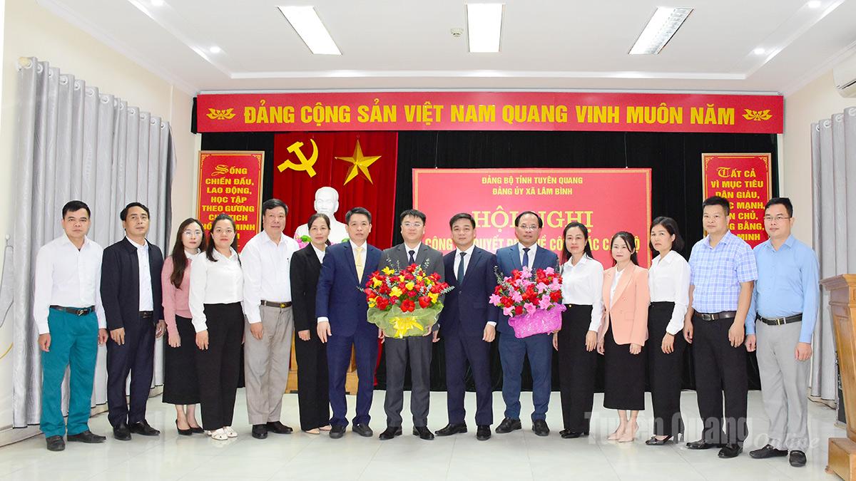 Lãnh đạo tỉnh và các đồng chí trong BCH Đảng bộ xã Lâm Bình tặng hoa chúc mừng 2 đồng chí nhận nhiệm vụ mới.