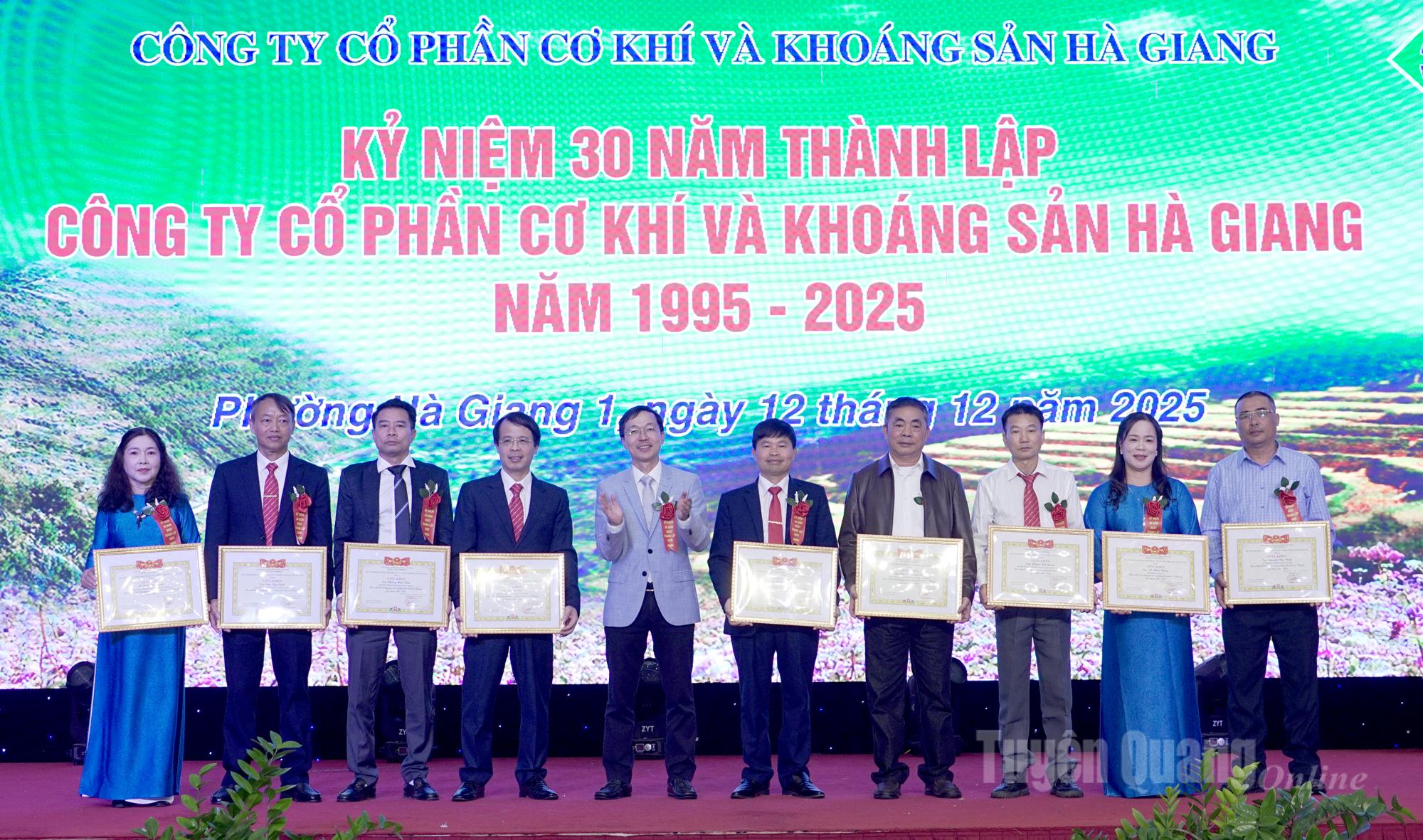 Tại buổi Lễ, Phó Chủ tịch UBND tỉnh Hoàng Gia Long đã trao Bằng khen của Chủ tịch UBND tỉnh cho các tập thể và cá nhân của công ty vì có thành tích trong công tác an sinh xã hội. Buổi lễ công bố quyết định của Tổng cục Hải quan về việc công nhận tập thể, cá nhân tiêu biểu về phát triển quan hệ đối tác hải quan, doanh nghiệp và các bên liên quan cho Công ty CP Cơ khí và khoáng sản Hà Giang.