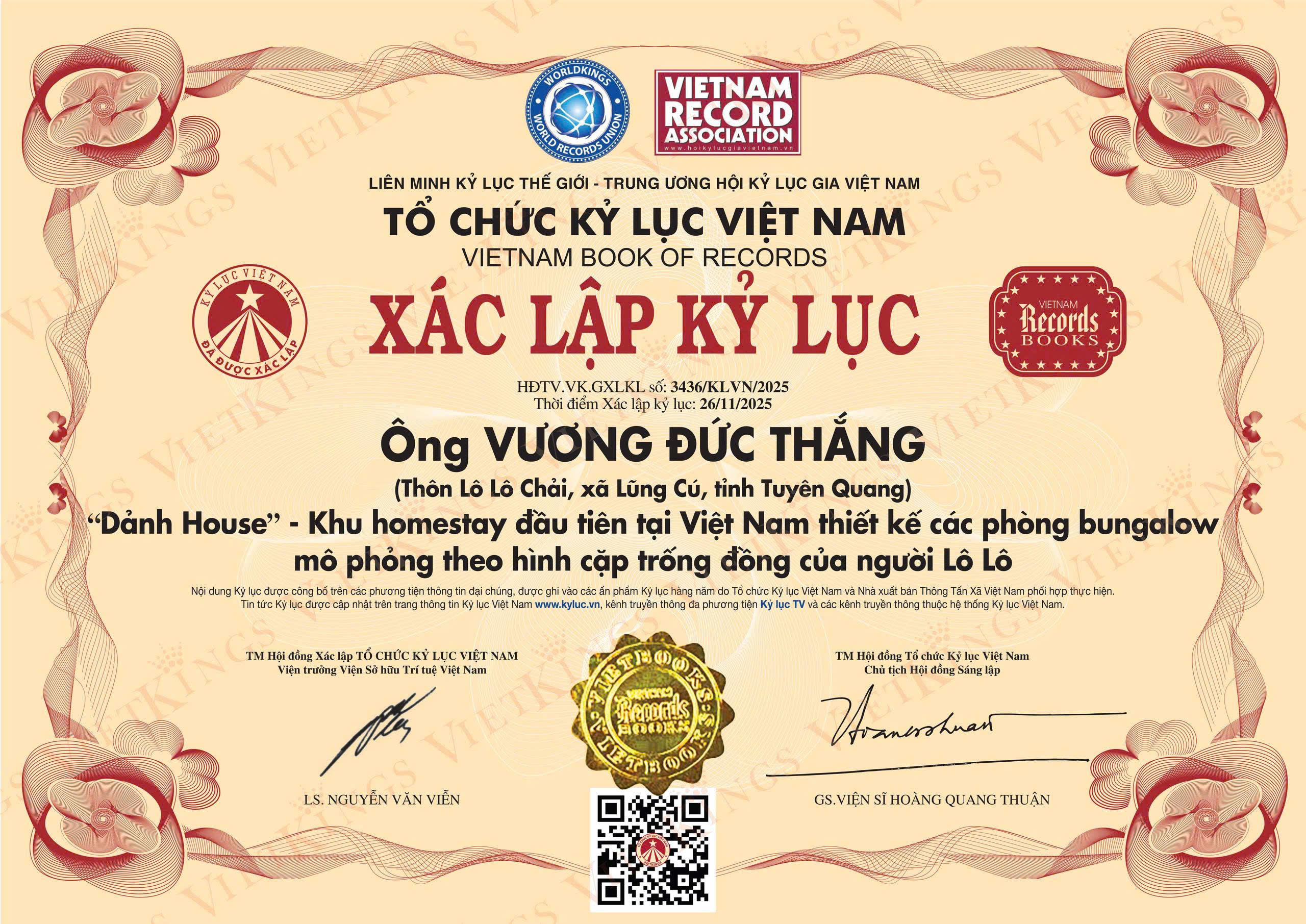 Dảnh House được Tổ chức Kỷ lục Việt Nam công bố xác lập kỷ lục - Khu nghỉ dưỡng đầu tiên tại Việt Nam thiết kế các phòng bungalow mô phỏng theo hình cặp trống đồng của người Lô Lô.