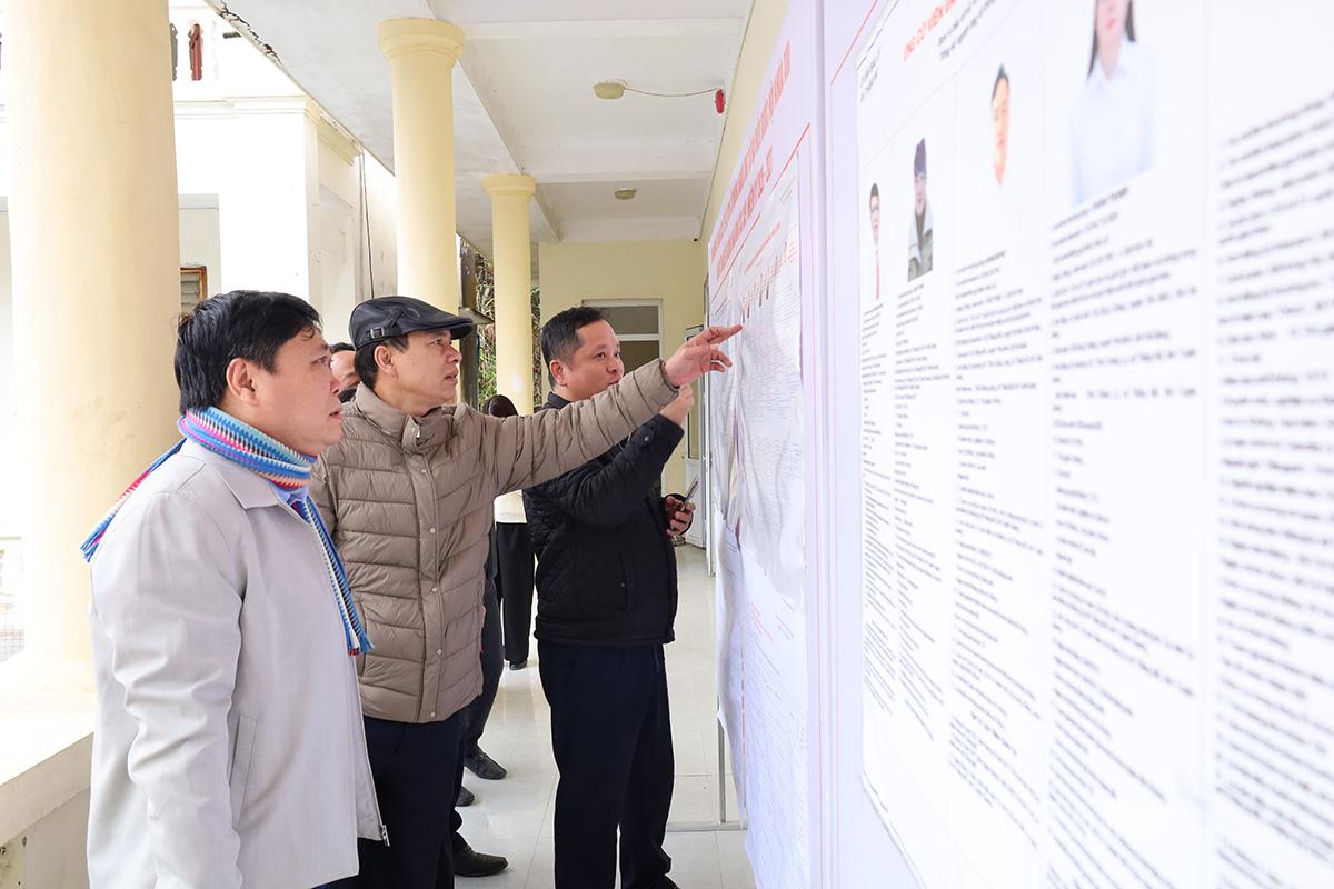Trưởng ban Tuyên giáo và Dân vận Tỉnh ủy Trần Mạnh Lợi kiểm tra việc niêm yết danh sách đại biểu ứng cử và gặp gỡ cử tri tại tổ dân phố Phan Thiết 1, 2, 3, phường Minh Xuân.