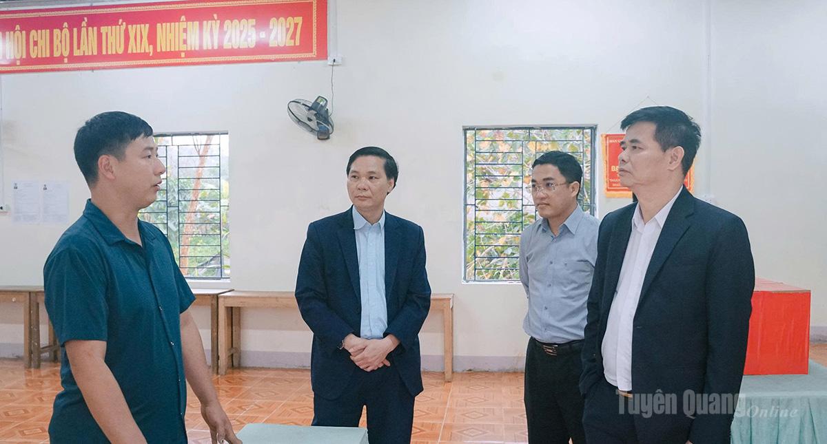 Đồng chí Nguyễn Trung Ngọc, Giám đốc Sở Văn hóa, Thể thao và Du lịch trao đổi, nắm bắt tình hình triển khai bầu cử tại thôn Mới, xã Xuân Giang.
