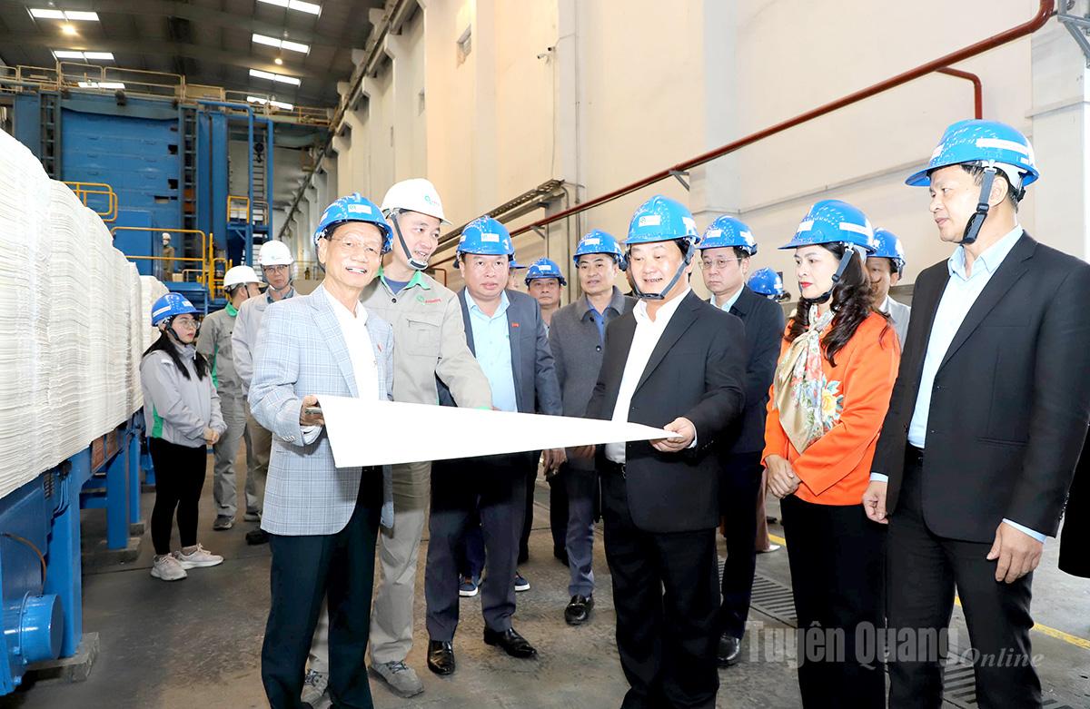 Phát biểu tại buổi làm việc, đồng chí Bí thư Tỉnh ủy ghi nhận và biểu dương những đóng góp của Công ty Cổ phần Giấy An Hòa vào sự phát triển kinh tế - xã hội chung của tỉnh Tuyên Quang, đặc biệt là nộp ngân sách, giải quyết việc làm cho con em địa phương. Để doanh nghiệp phát triển bền vững trong thời gian tới, Bí thư Tỉnh ủy đề nghị Công ty Cổ phần Giấy An Hoà quy hoạch vùng nguyên liệu ổn định, có sự gắn kết với các cơ quan quản lý nhà nước, người dân và các cơ sở cùng ngành nghề đảm bảo hài hòa; phân bổ tỷ lệ lao động người địa phương hợp lý để đào tạo, bồi dưỡng, tiếp nhận vào công ty làm việc tạo sự gắn kết giữa nhà nước – doanh nghiệp và người dân; tiếp tục đầu tư, cải tiến kỹ thuật để nâng cao năng suất và chất lượng sản phẩm, tăng sức cạnh tranh trên thị trường quốc tế; tuyệt đối tuân thủ các quy định về môi trường, đảm bảo không ảnh hưởng đến đời sống của nhân dân khu vực xã Bình Ca và các vùng lân cận; tiếp tục quan tâm, thực hiện tốt các chế độ an sinh xã hội, xây dựng môi trường làm việc an toàn, hiện đại.