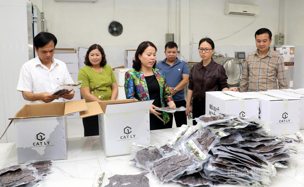 Đồng chí Lý Thị Lan, Ủy viên Ban Thường vụ Tỉnh ủy, Trưởng đoàn ĐBQH chuyên trách khoá XV tỉnh thăm cơ sở chế biến sản phẩm bò H’mong của Hợp tác Cát Lý, thôn Mịch A, xã Thuận Hoà.