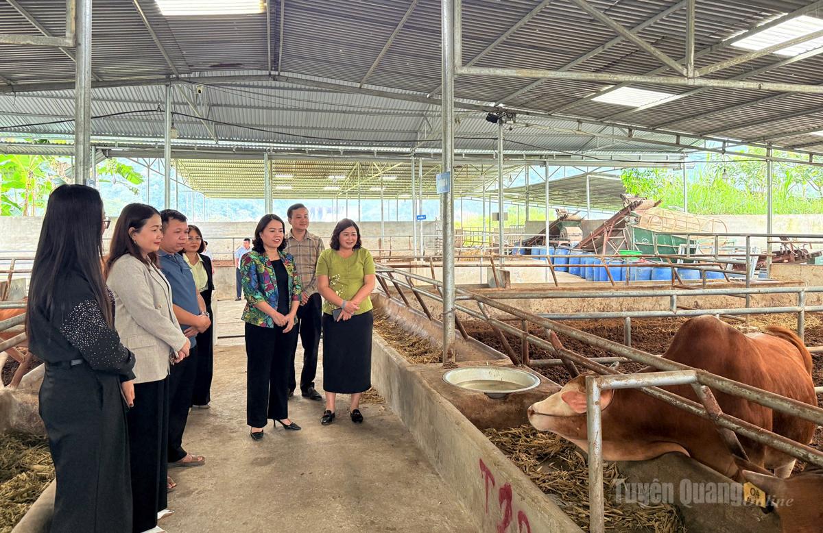 Đồng chí Lý Thị Lan, Ủy viên Ban Thường vụ Tỉnh ủy, Trưởng đoàn ĐBQH chuyên trách khoá XV tỉnh thăm trang trại nuôi bò H’mong của Hợp tác xã Cát Lý, thôn Mịch B, xã Thuận Hoà.