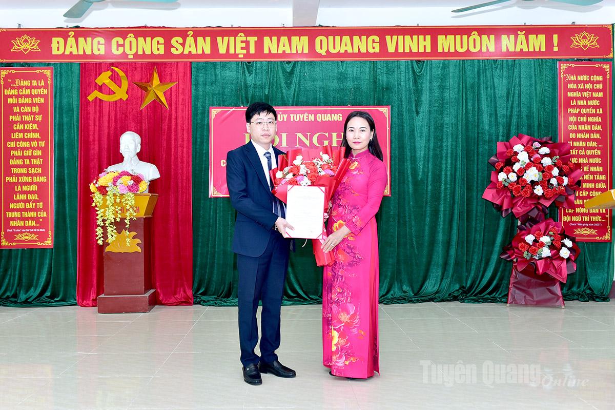 Đồng chí Phó Bí thư Thường trực Đảng ủy UBND tỉnh Nông Thị Bích Huệ trao Quyết định, tặng hoa chúc mừng đồng chí Nguyễn Lê Huy, tân Phó Bí thư Thường trực Đảng ủy xã Đồng Yên.