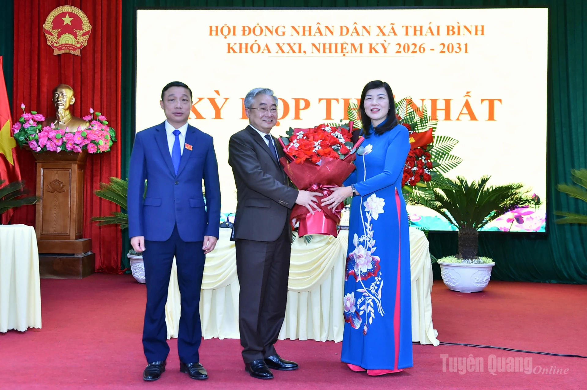 Đồng chí Phó Chủ tịch HĐND tỉnh Phạm Thị Minh Xuân tặng hoa chúc mừng đồng chí Nguyễn Ngọc Toàn, Bí thư Đảng ủy được bầu giữ chức danh Chủ tịch HĐND xã Thái Bình, nhiệm kỳ 2026-2031.