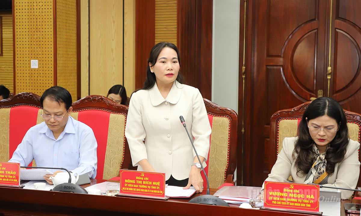 Phó Bí thư Thường trực chuyên trách Đảng ủy UBND tỉnh Nông Thị Bích Huệ thảo luận tại hội nghị.