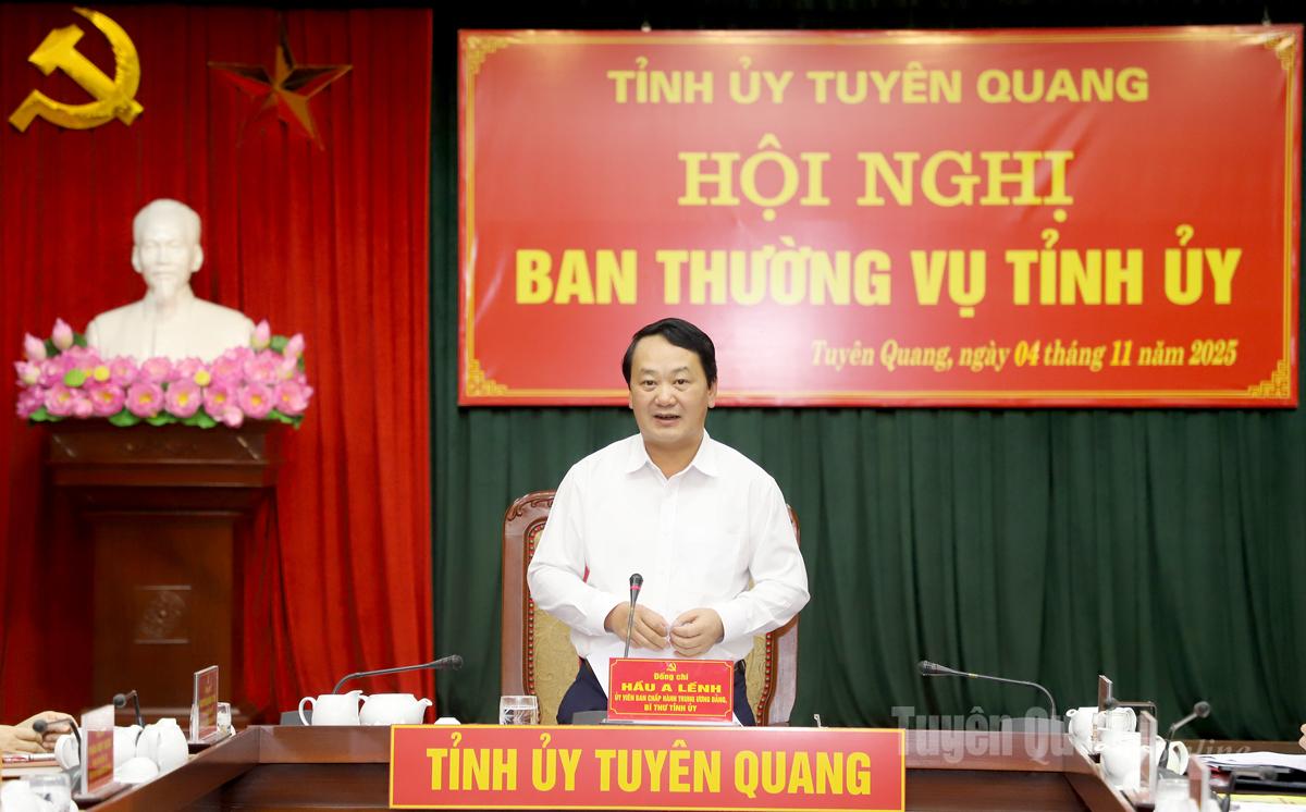 Bí thư Tỉnh ủy Hầu A Lềnh đề nghị Ban Thường vụ Tỉnh ủy tập trung lãnh đạo, chỉ đạo việc rà soát, cập nhật, điều chỉnh các nội dung kế hoạch, chương trình hành động của các cấp ủy, tổ chức Đảng đã ban hành, đảm bảo cụ thể hóa, triển khai thực hiện các mục tiêu, khâu đột phá, nhiệm vụ trọng tâm và giải pháp thực hiện Nghị quyết Đại hội đại biểu Đảng bộ tỉnh lần thứ I phù hợp tình hình thực tiễn của địa phương. Tiếp tục củng cố, kiện toàn, sắp xếp tổ chức bộ máy, nâng cao hiệu quả hoạt động của chính quyền địa phương 2 cấp. Lãnh đạo, chỉ đạo triển khai cuộc bầu cử đại biểu Quốc hội khóa XVI và bầu cử đại biểu Hội đồng nhân dân các cấp, nhiệm kỳ 2026-2031; Đại hội đại biểu Mặt trận Tổ quốc Việt Nam tỉnh Tuyên Quang lần thứ I, nhiệm kỳ 2025-2030. Đồng thời, tập trung lãnh đạo, chỉ đạo thực hiện có hiệu quả các nhiệm vụ, giải pháp đẩy mạnh phát triển kinh tế - xã hội năm 2025, đảm bảo hoàn thành mục tiêu tăng trưởng đạt 8% trở lên. Theo dõi chặt chẽ tiến độ thu ngân sách nhà nước, giải ngân vốn đầu tư công và các chương trình mục tiêu quốc gia, tập trung tháo gỡ những khó khăn vướng mắc, đẩy nhanh tiến độ thi công các công trình, dự án trọng điểm đảm bảo giải ngân vốn đầu tư công ở mức cao nhất.