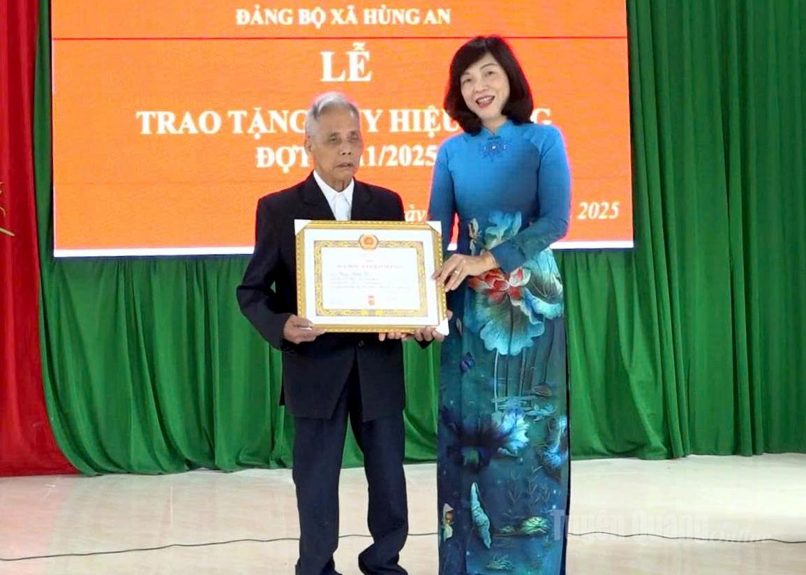 Phó Chủ tịch HĐND tỉnh Phạm Thị Minh Xuân trao Huy hiệu Đảng cho đảng viên Đảng bộ xã Hùng An.
