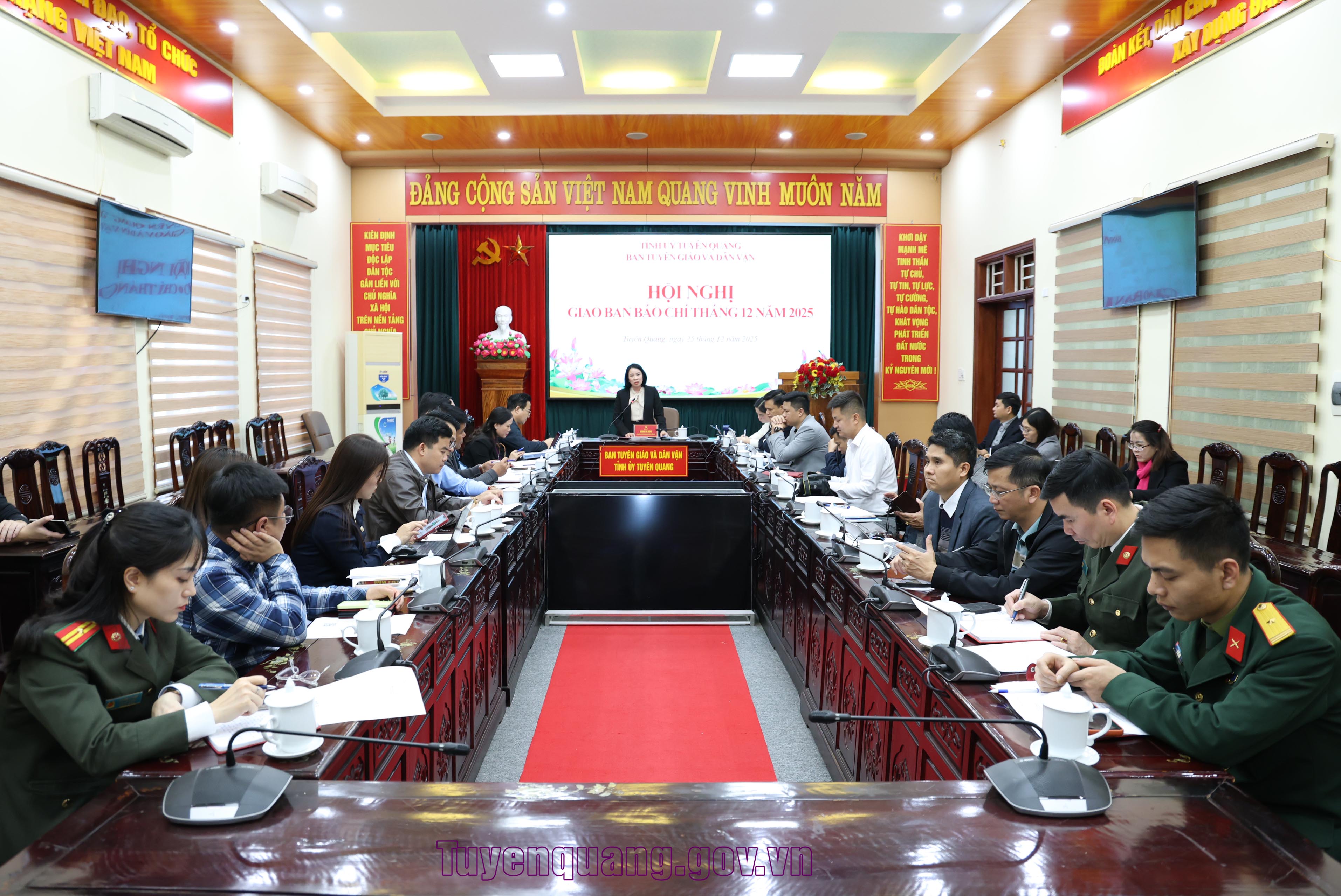 Lãnh đạo Sở Văn hóa, Thể thao và Du lịch thông tin kế hoạch tổ chức các chương trình nghệ thuật mừng Đảng, mừng Xuân, chào năm mới 2026; các hoạt động đón những vị khách du lịch đầu tiên đến với Tuyên Quang trong năm mới, tạo điểm nhấn quảng bá hình ảnh địa phương giàu bản sắc, thân thiện và hấp dẫn. Cùng với đó, Hội Nhà báo tỉnh đã thông tin về công tác chuẩn bị và tổ chức Hội Báo xuân Bính Ngọ năm 2026, góp phần tạo không khí phấn khởi, lan tỏa đời sống báo chí và văn hóa tinh thần trong dịp Tết cổ truyền của dân tộc.