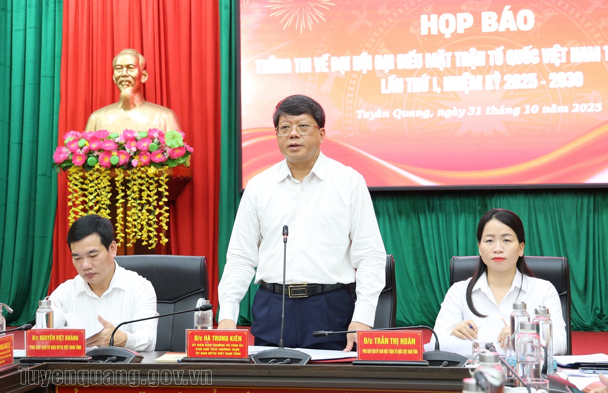 Phát biểu kết luận buổi họp báo, đồng chí Phó Chủ tịch Thường trực Ủy ban MTTQ Việt Nam tỉnh Hà Trung Kiên cảm ơn những ý kiến đóng góp của các đại biểu, Ủy ban MTTQ tỉnh sẽ tiếp thu, điều chỉnh nội dung tuyên truyền để phù hợp, đạt kết quả tốt hơn. Để công tác tuyên truyền Đại hội có trọng tâm, trọng điểm, Ủy ban MTTQ Việt Nam tỉnh đề nghị Ban Tuyên giáo và Dân vận Tỉnh uỷ, Sở Văn hóa Thể thao và Du lịch tiếp tục quan tâm định hướng công tác tuyên truyền về Đại hội. Đề nghị các cơ quan báo chí Trung ương và của tỉnh, các tổ chức chính trị - xã hội, các tổ chức hội tiếp tục tuyên truyền sâu rộng đến các tầng lớp nhân dân về vị trí, vai trò của MTTQ Việt Nam, khối đại đoàn kết toàn dân tộc, các điển hình tiên tiến, gương cán bộ Mặt trận tiêu biểu; kết quả nổi bật hoạt động của MTTQ tỉnh trong nhiệm kỳ qua và mục tiêu, Chương trình hành động của MTTQ tỉnh, nhiệm kỳ 2025 - 2030. Qua đó tạo hiệu ứng, sức lan toả trong cộng đồng, tạo sự đồng thuận trong các tầng lớp nhân dân hướng về Đại hội.
