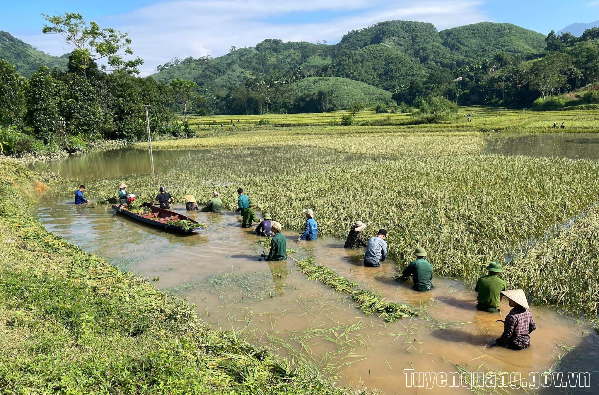 Các lực lượng xã Bạch Xa giúp người dân thu hoạch lúa khi bị nước ngập.