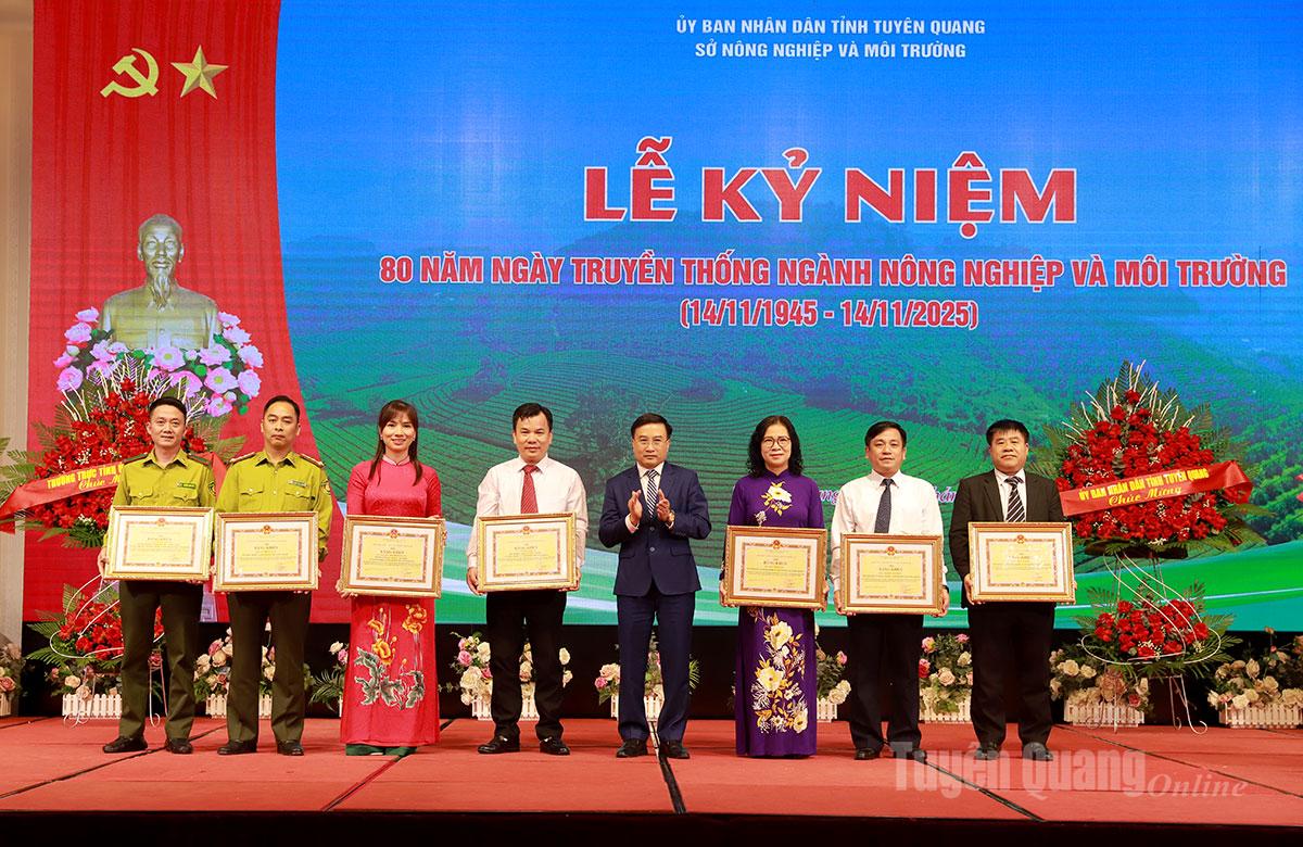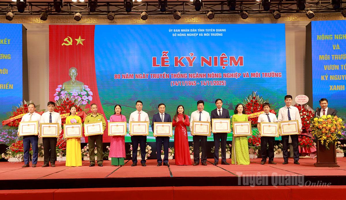 Nhân dịp này Bộ Nông nghiệp và Môi trường tặng Bằng khen cho 3 tập thể, 10 cá nhân; Chủ tịch UBND tỉnh tặng Bằng khen cho 1 tập thể và 7 cá nhân thuộc Sở Nông nghiệp và Môi trường đã có thành tích xuất sắc trong thực hiện các phong trào thi đua yêu nước giai đoạn 2021-2025, nhân dịp kỷ niệm 80 năm thành lập ngành.