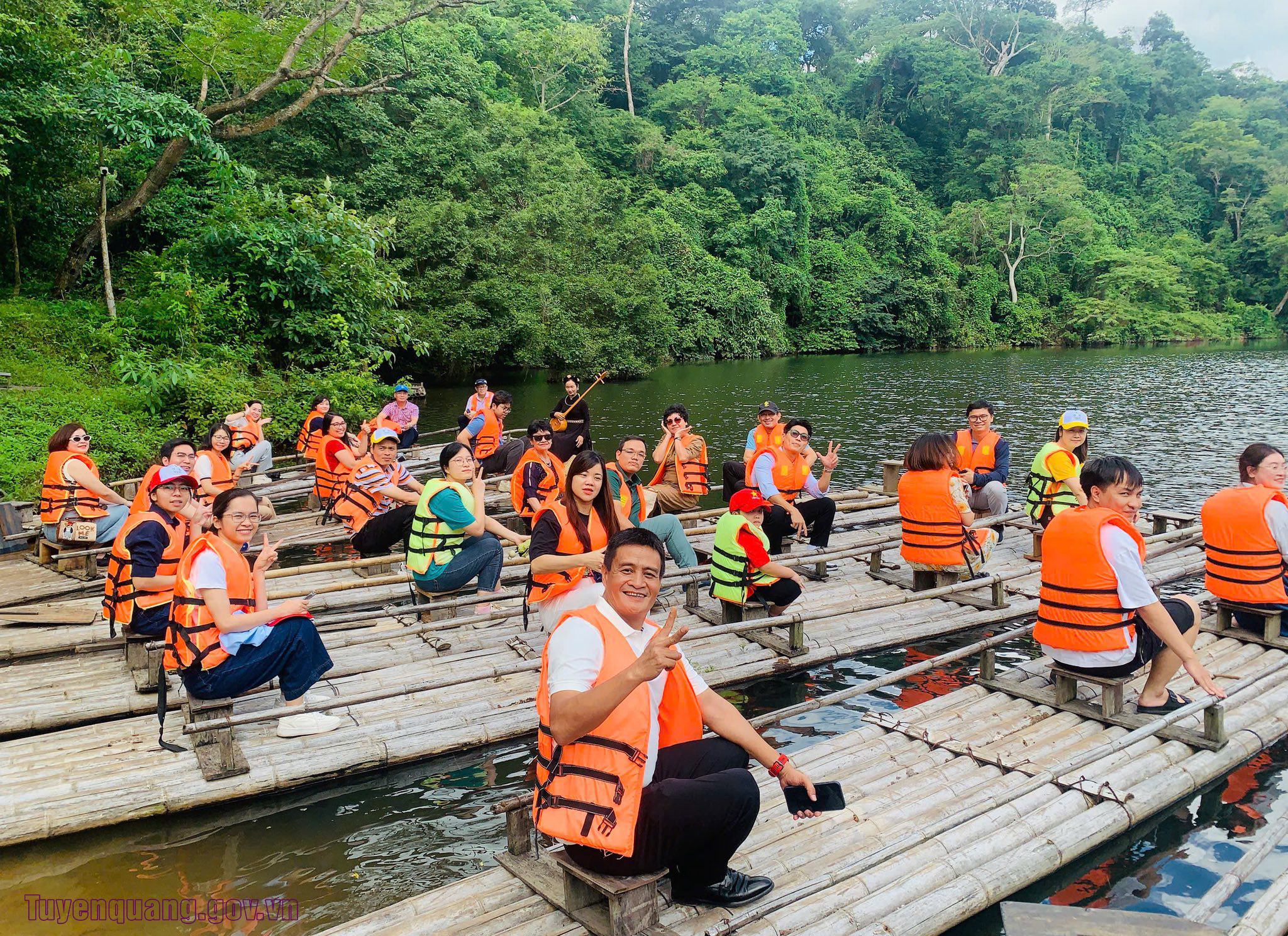 Du khách trải nghiệm bơi mảng hát Then trên hồ Nà Nưa.