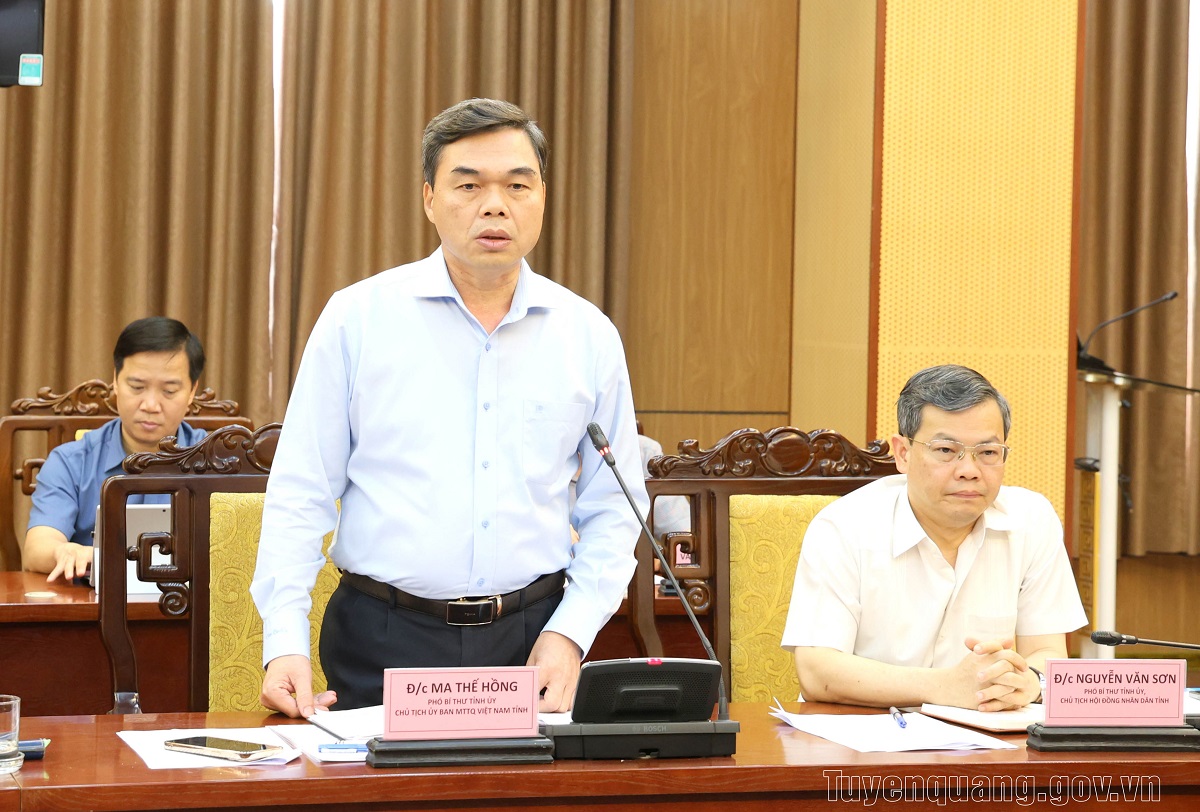 Đồng chí Phó Bí thư Tỉnh ủy, Chủ tịch Ủy ban MTTQ tỉnh Ma Thế Hồng phát biểu tại cuộc họp.