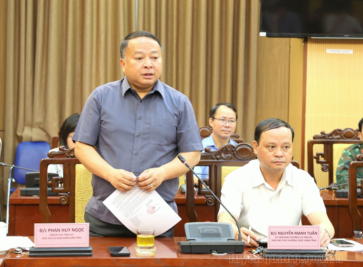 Đồng chí Phó Bí thư Tỉnh ủy, Chủ tịch UBND tỉnh Phan Huy Ngọc báo cáo tình hình mưa lũ, thiệt hại và biện pháp phòng, chống, ứng phó, khắc phục ngập lụt, sạt lở trên địa bàn tỉnh.