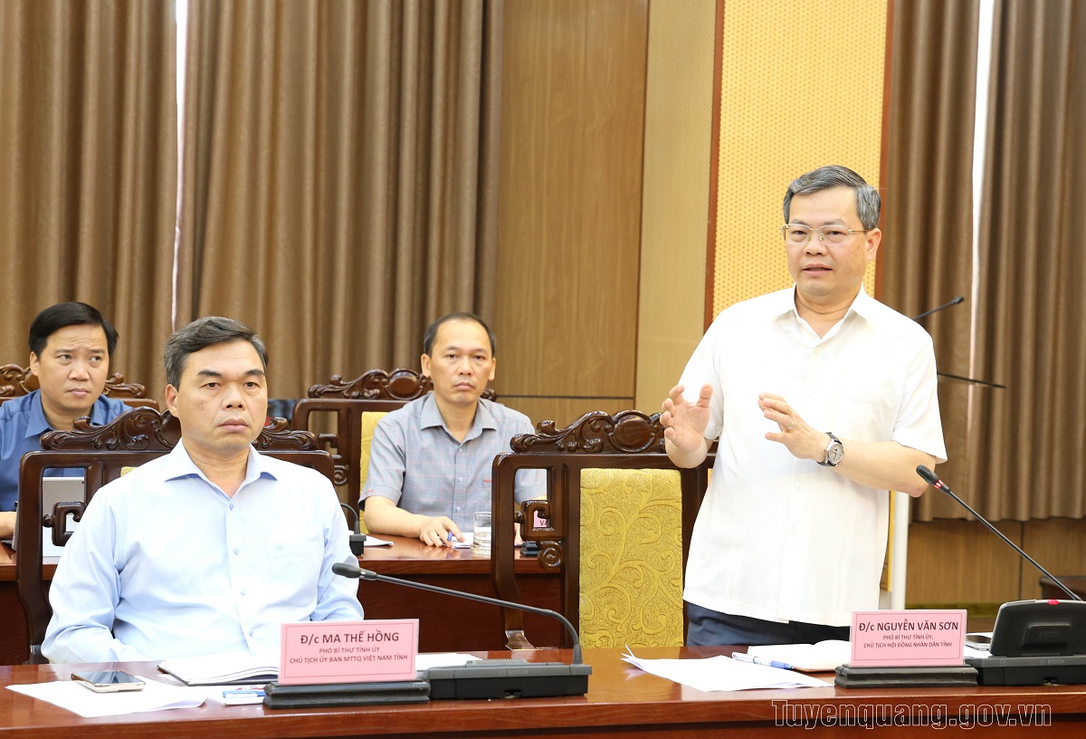 Đồng chí Phó Bí thư Tỉnh ủy, Chủ tịch HĐND tỉnh Nguyễn Văn Sơn phát biểu tại cuộc họp.