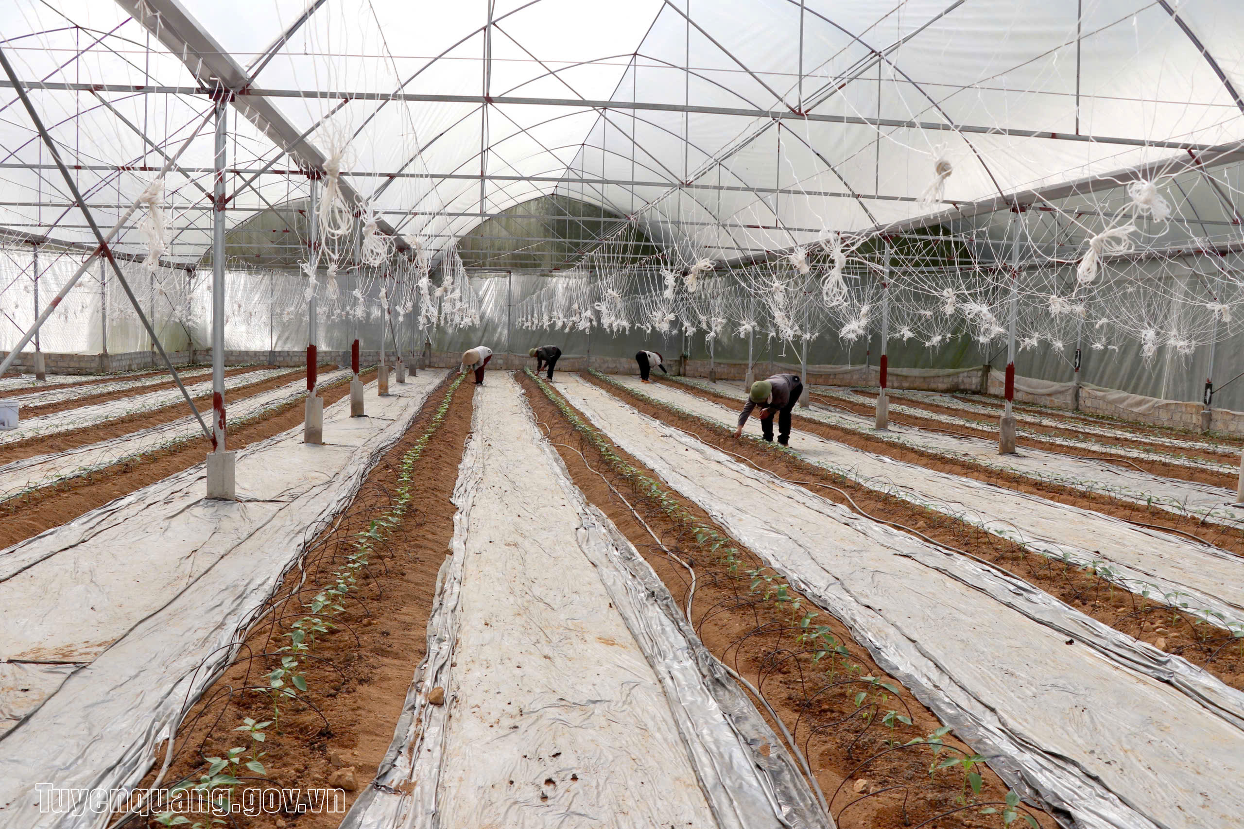Công nhân làm việc tại nhà màng của Công ty TNHH MTV Sơn Dương Green Farm, xã Sơn Dương.