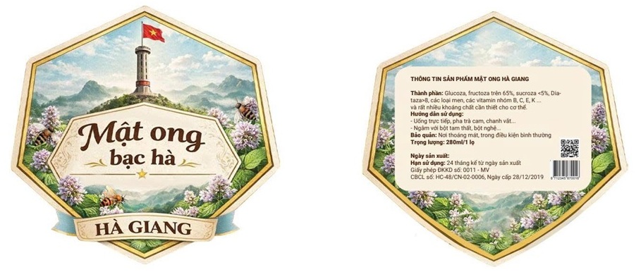 Đáng chú ý, thiết kế bao bì sản phẩm được chú trọng theo hướng cao cấp, phù hợp làm quà tặng. Lọ mật ong được làm từ thủy tinh trong suốt, kiểu dáng lấy cảm hứng từ cột cờ Lũng Cú, vừa đảm bảo tính thẩm mỹ vừa thể hiện giá trị biểu trưng vùng miền. Hộp đựng sản phẩm được thiết kế dạng hộp quà với chất liệu carton cứng, ép kim logo, kết hợp các chi tiết tổ ong và hoa bạc hà, tạo ấn tượng sang trọng và chuyên nghiệp.