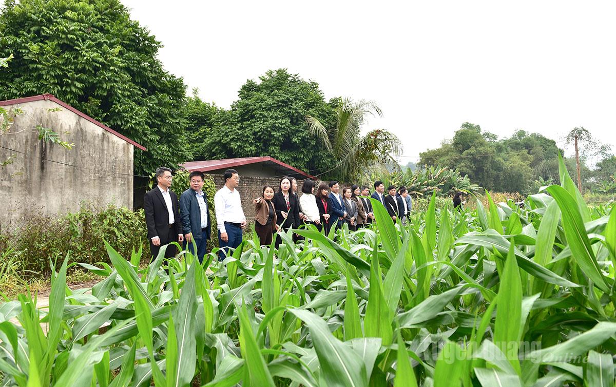 Đồng chí Phó Bí thư Thường trực Đảng ủy UBND tỉnh Nông Thị Bích Huệ và các đại biểu tham quan, tìm hiểu việc trồng cây trồng vụ Đông trên địa bàn xã Bình Xa.