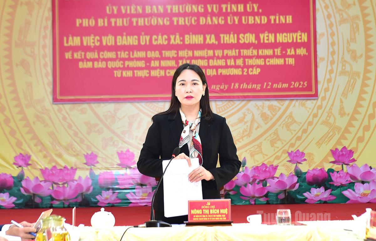 Phát biểu kết luận buổi làm việc, Phó Bí thư Thường trực Đảng ủy UBND tỉnh Nông Thị Bích Huệ ghi nhận, biểu dương những nỗ lực, kết quả mà các xã đã đạt được trong bối cảnh còn nhiều khó khăn, chịu ảnh hưởng của thiên tai, dịch bệnh, bộ máy chính quyền địa phương 2 cấp mới đi vào hoạt động. Đồng chí nhấn mạnh, các xã đã cơ bản hoàn thành và đạt các mục tiêu, chỉ tiêu đề ra, trong đó có nhiều chỉ tiêu quan trọng như thu ngân sách, thu nhập bình quân đầu người, duy trì chuẩn Nông thôn mới.