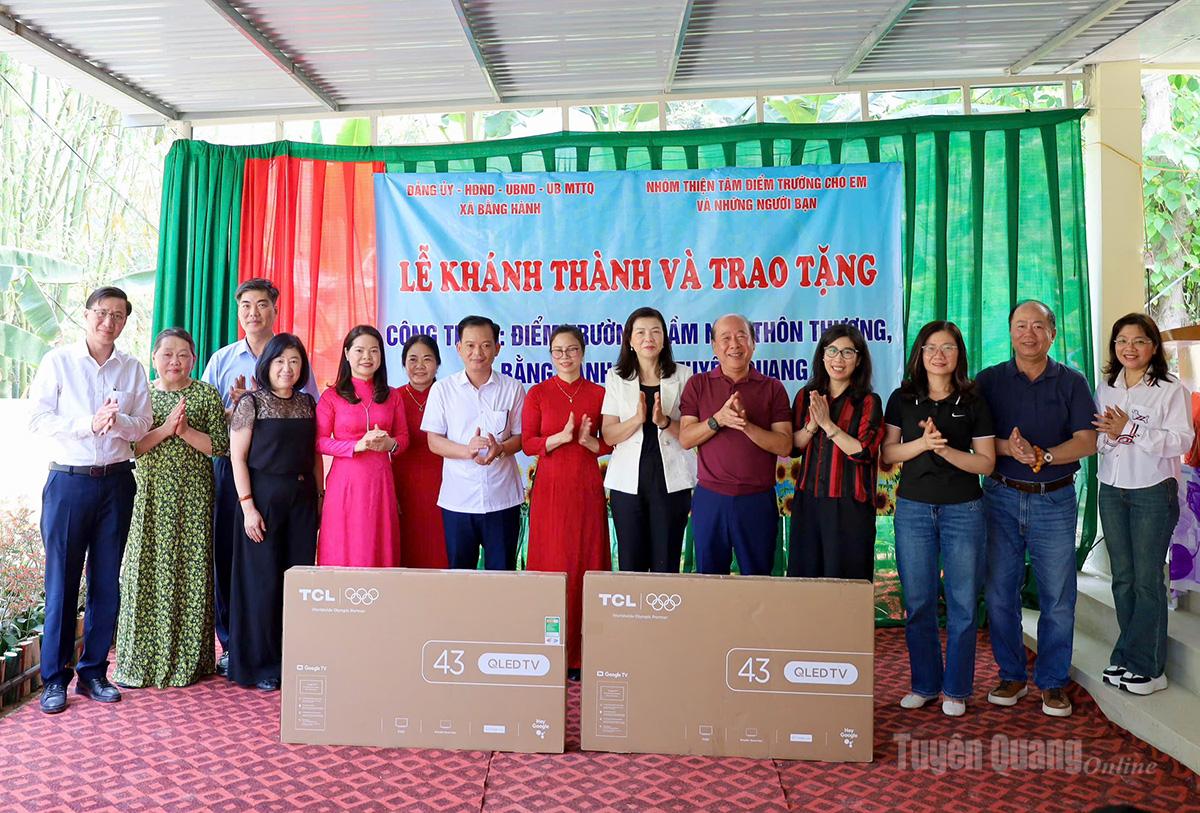 Phó Chủ tịch HĐND tỉnh Phạm Thị Minh Xuân và đại diện nhà tài trợ trao tặng tivi cho trường Mầm non Bằng Hành.