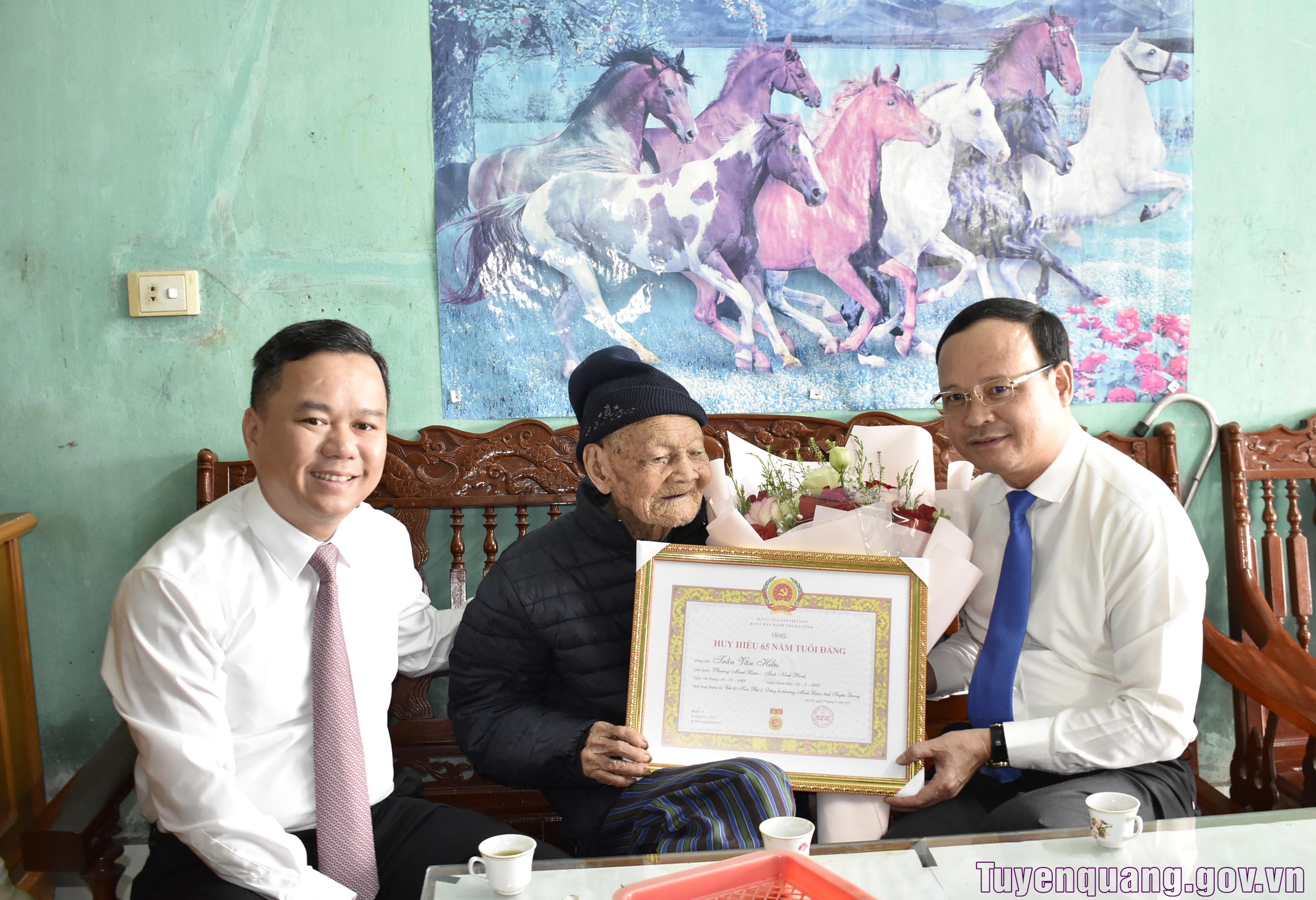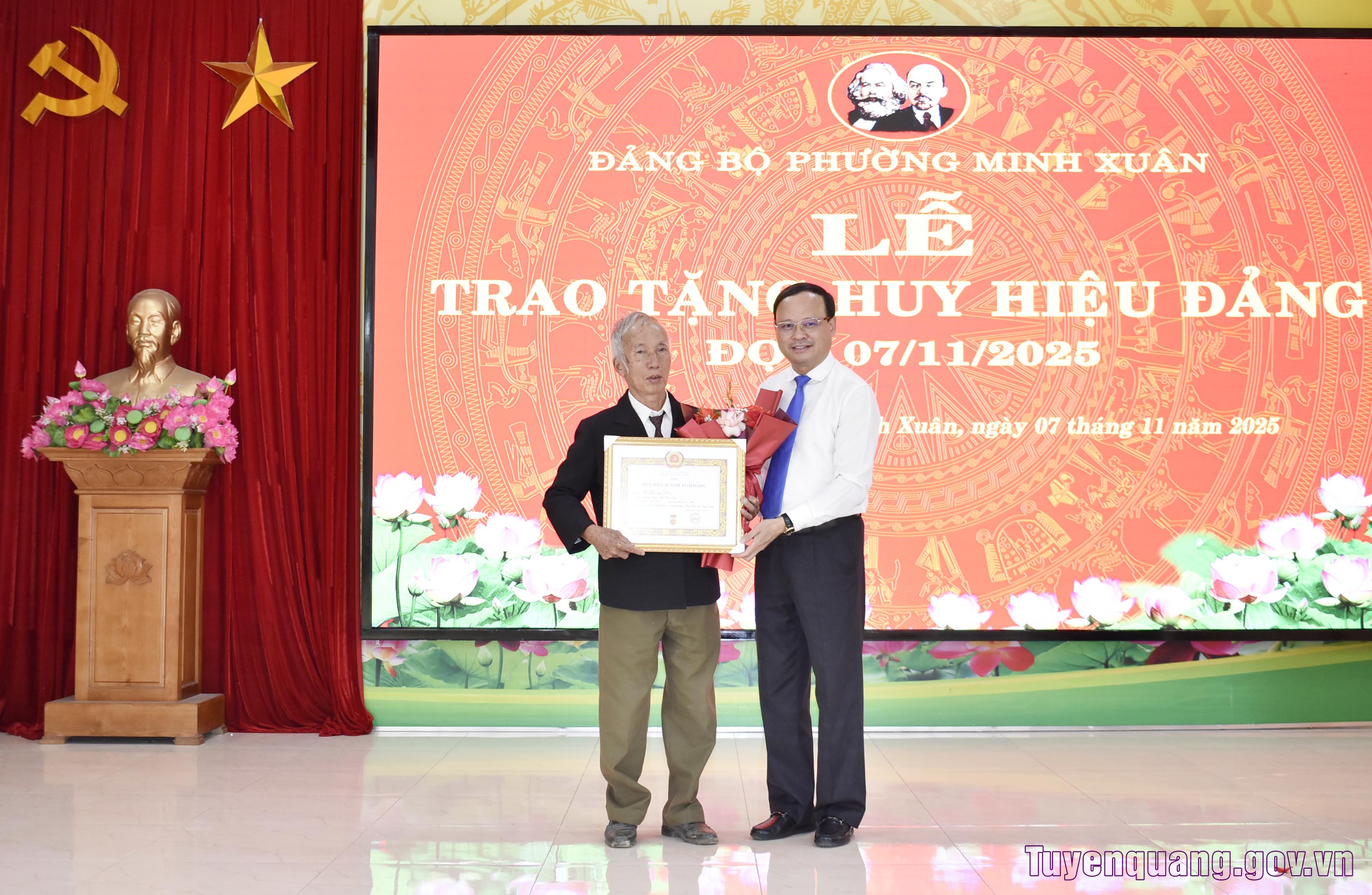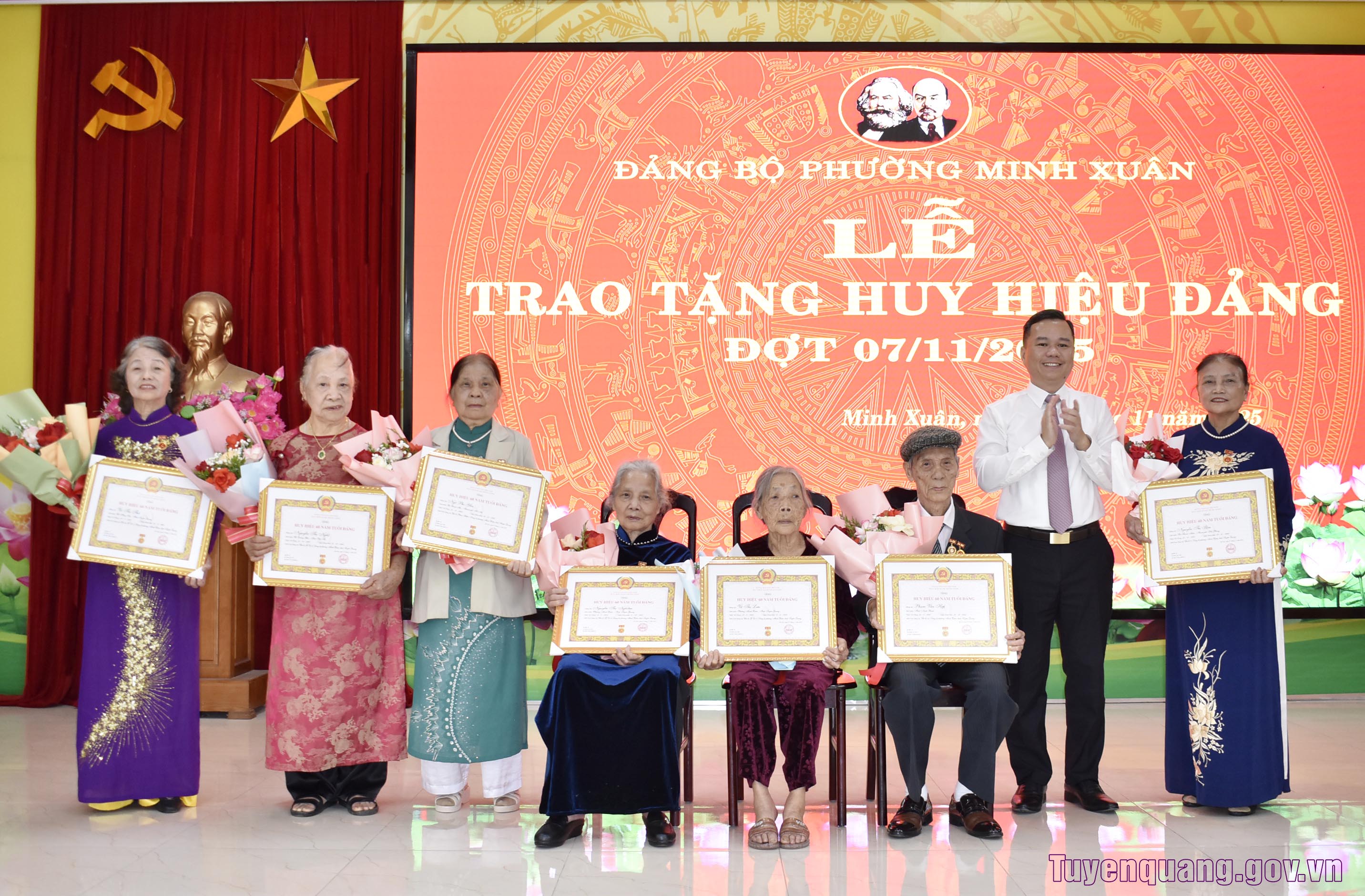 Tại buổi lễ, đồng chí Phó Chủ tịch Thường trực UBND tỉnh Nguyễn Mạnh Tuấn đã trao Huy hiệu 65 năm tuổi Đảng cho đảng viên Nhữ Văn Quang, Chi bộ Kim Phú 1; đảng viên Đỗ Tiến, Chi bộ Tân Quang 16, Đảng bộ phường Minh Xuân. Trao Huy hiệu 60 năm tuổi Đảng cho đảng viên Lê Quang Đôn, Chi bộ Tân Quang 11, Đảng bộ phường Minh Xuân - nguyên Ủy viên Ban Thường vụ Tỉnh ủy, nguyên Phó Chủ tịch UBND tỉnh Tuyên Quang.