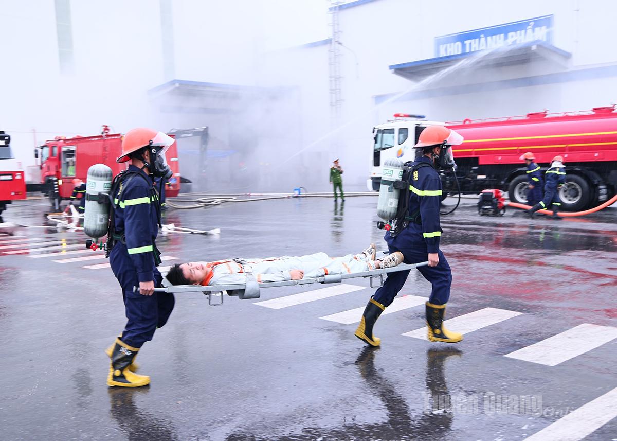 Phần diễn tập thực binh theo tình huống giả định xảy ra cháy xe container tại khu vực chờ xuất hàng của kho thành phẩm tại Nhà máy nguyên liệu sinh khối Erex Sakura Tuyên Quang. Do cabin xe chứa nhiều vật liệu dễ cháy, chỉ sau vài phút, nhiệt độ cao đã làm biến dạng bình chứa, dẫn đến rò rỉ và nhiên liệu cháy tràn ra xung quanh, tiềm ẩn nguy cơ cháy lan vào kho thành phẩm.