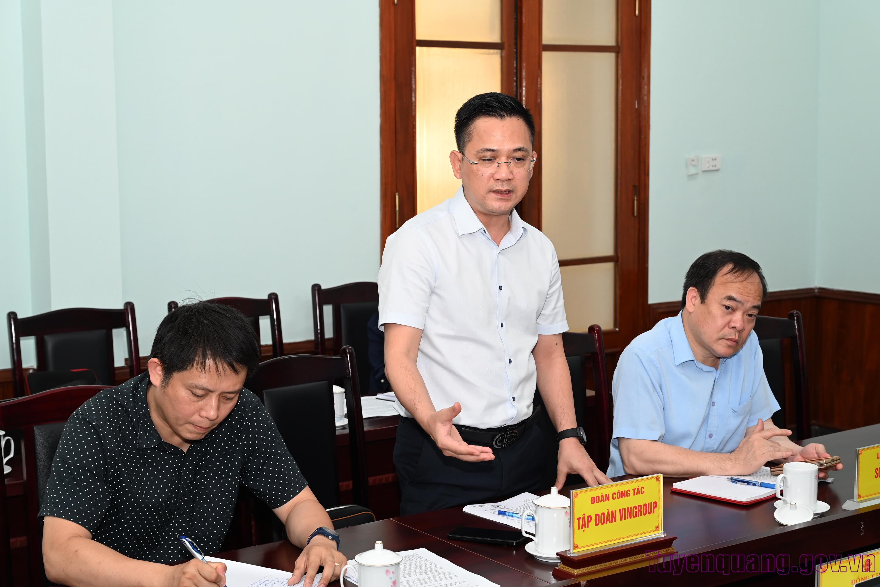 Ông Vũ Mạnh Cường, Phó Giám đốc phát triển dự án Tập đoàn Vingroup, phát biểu trao đổi các nội dung liên quan đến tiến độ và định hướng triển khai dự án tại buổi làm việc.