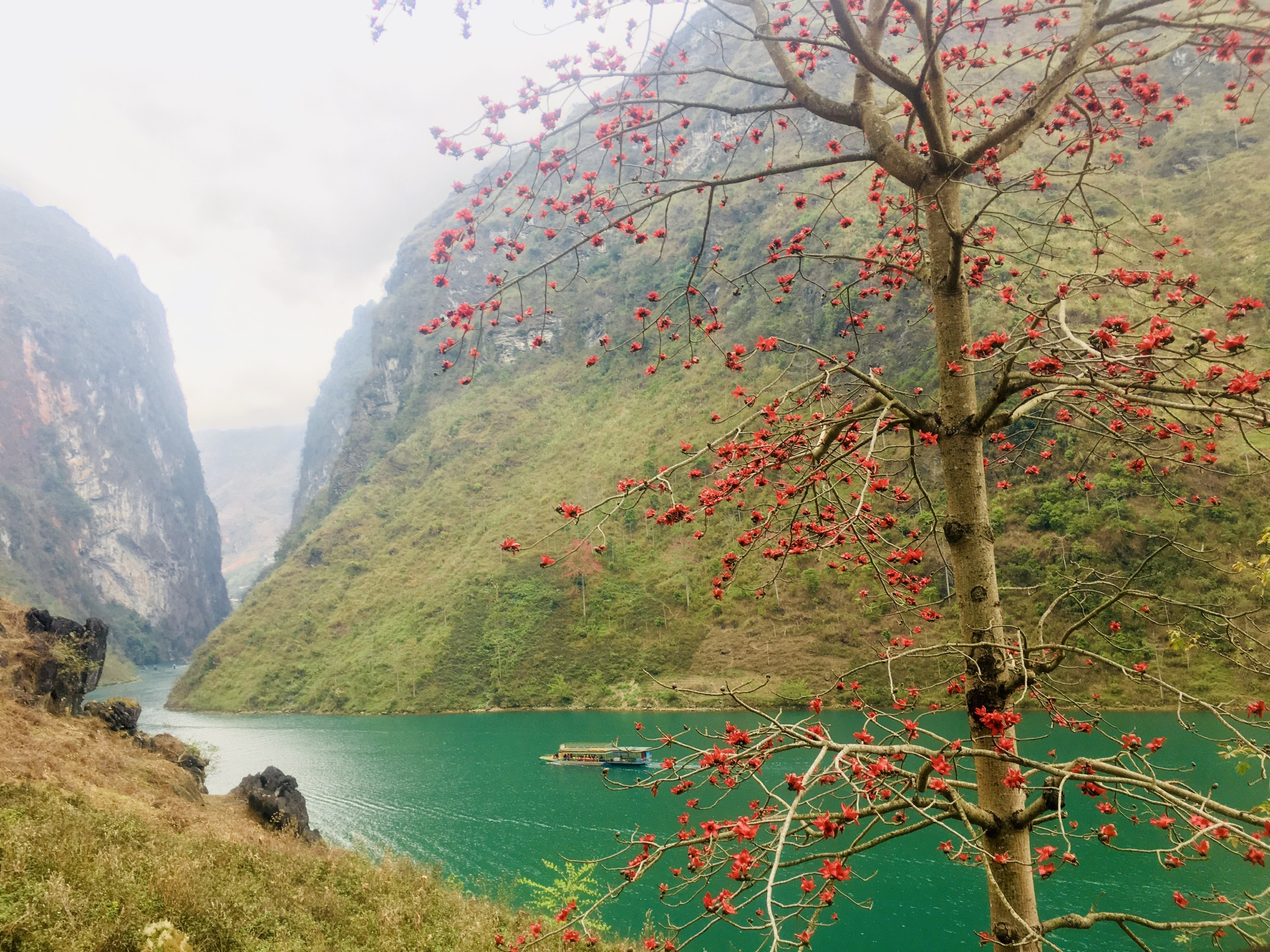 Dòng sông Nho Quế trong xanh tuyệt đẹp khi mùa hoa gạo nở.