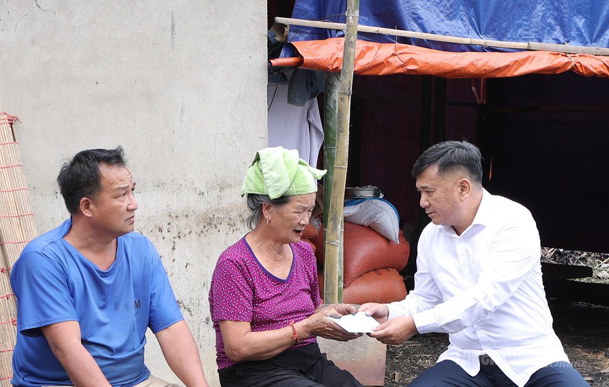 Đồng chí Hầu Minh Lợi trao kinh phí hỗ trợ gia đình bà Ma Thị Rắc bị hoả hoạn.