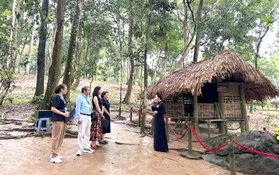 Thí sinh Nguyễn Thị Thùy Linh, hướng dẫn viên Bảo tàng tỉnh Tuyên Quang tại lán Nà Nưa.