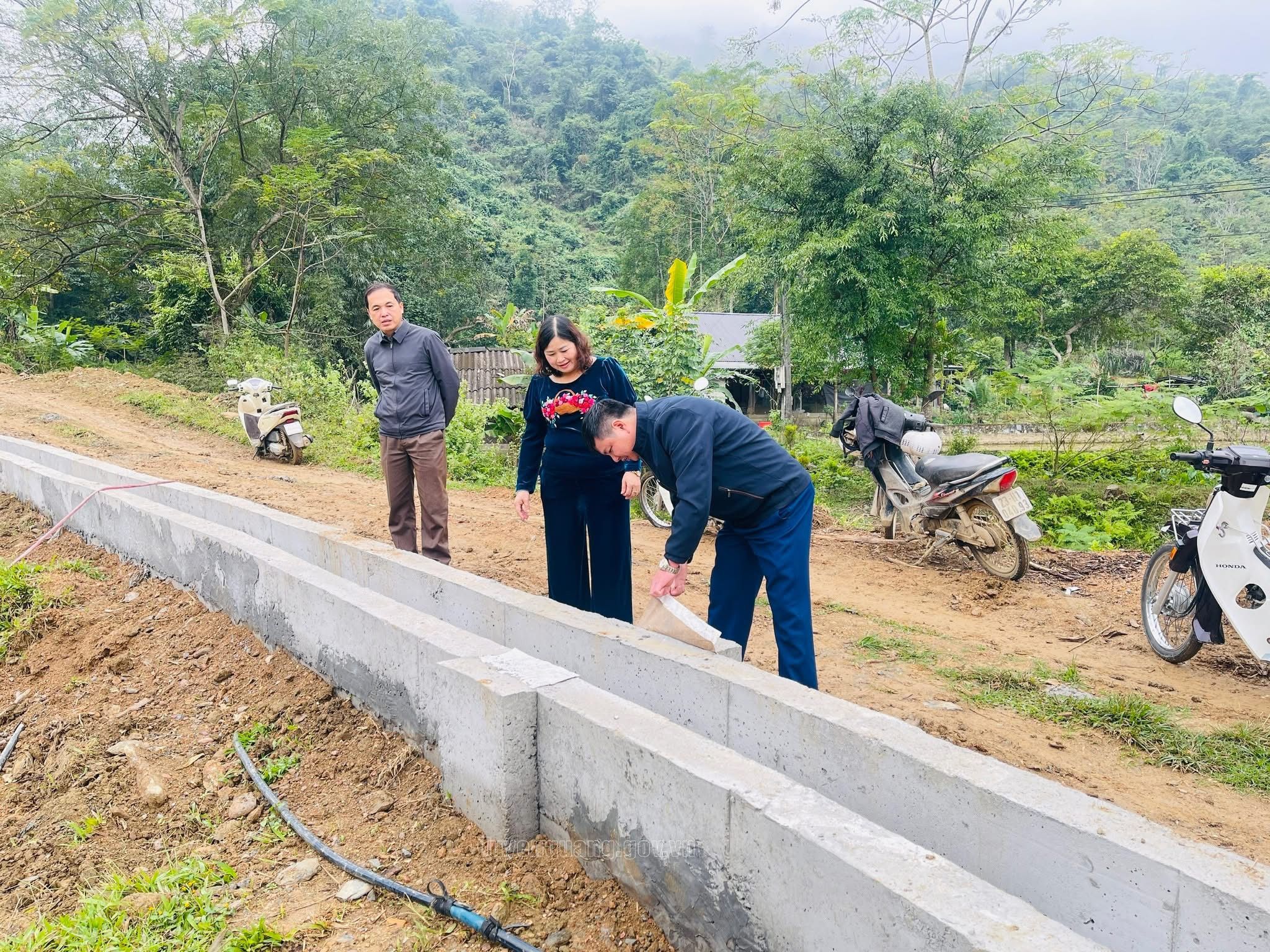 Bí thư, Chủ tịch HĐND xã Thuận Hòa Đặng Thị Phượng kiểm tra chất lượng thi công công trình thủy lợi trên địa bàn xã.
