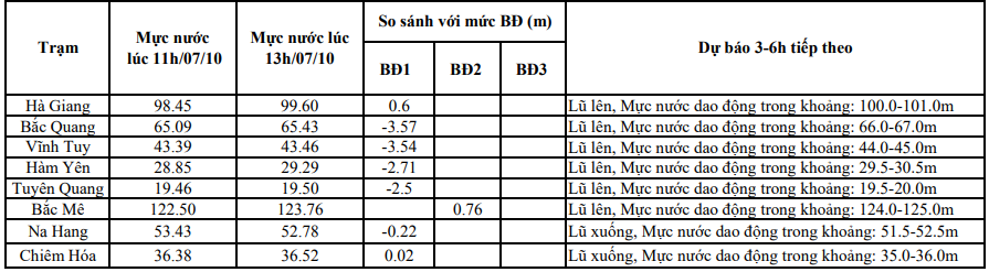 Lúc 12 giờ trưa ngày 07/10, mực nước trên sông Lô tại Hà Giang đạt 99,28 mét, cao hơn mức báo động I là 0,28 mét; trong khi trên sông Gâm tại Bắc Mê, mực nước lên tới 123,14 mét, vượt báo động II khoảng 0,14 mét.
