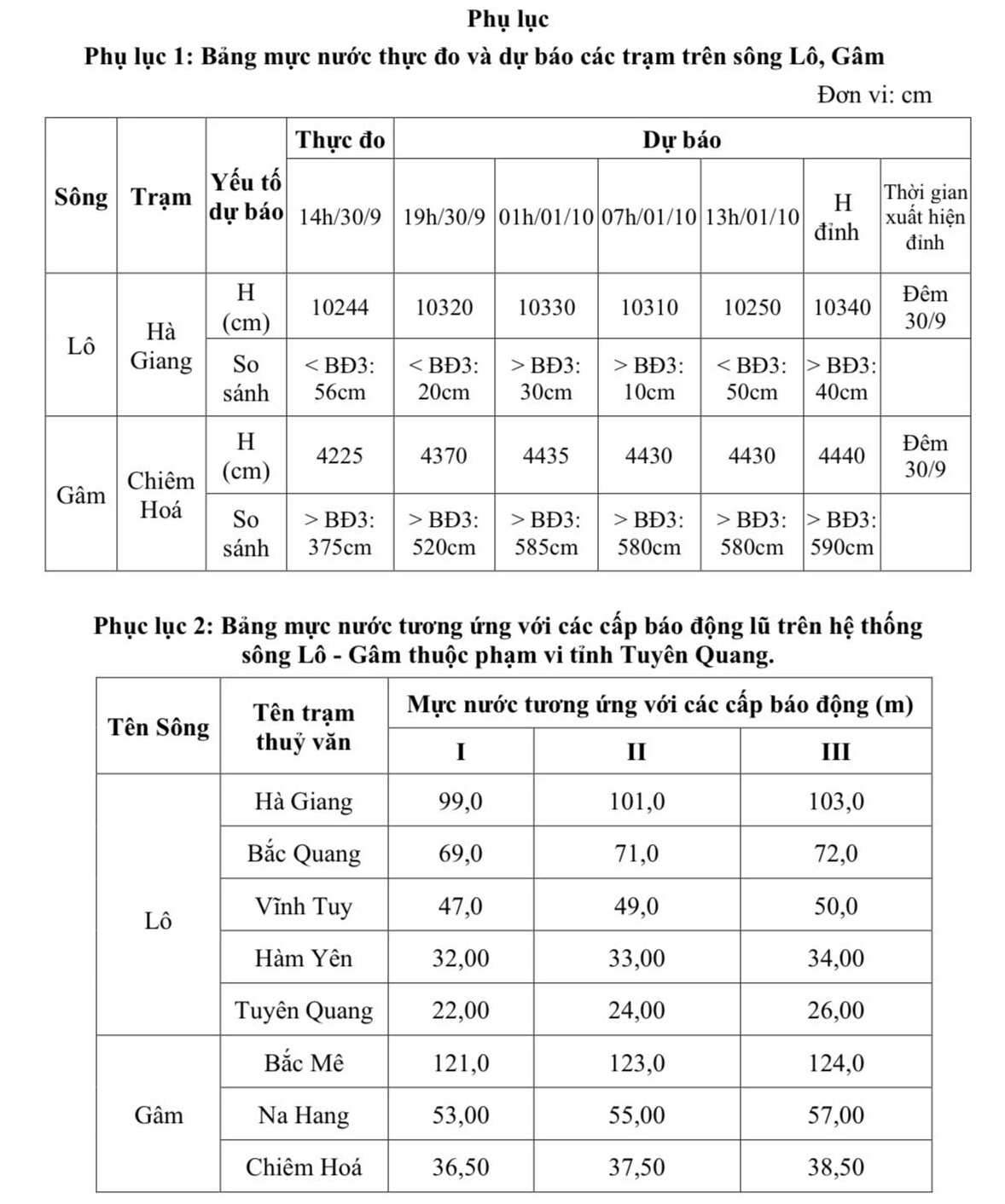Lúc 14h00 ngày 30/9 mực nước trên sông Lô Gâm như sau: Mực nước tại trạm Hà Giang là 102,44m (dưới BĐ3 0,56m), trạm Bắc Quang 68,41m (dưới BĐ1 0,59m), trạm Vĩnh Tuy là 47,07m (xấp xỉ BĐ1), trạm Hàm Yên 31,58m (dưới BĐ1 0,42m); trạm Tuyên Quang là 21,24m (dưới BĐI 0,76m); trạm Bắc Mê là 127,21m (trên BĐ3 là 3,21m), trạm Na Hang là 60,83m (trên BĐ3 3,83m), trạm Chiêm Hoá là 42,25m (trên BĐ3 3,75m).
