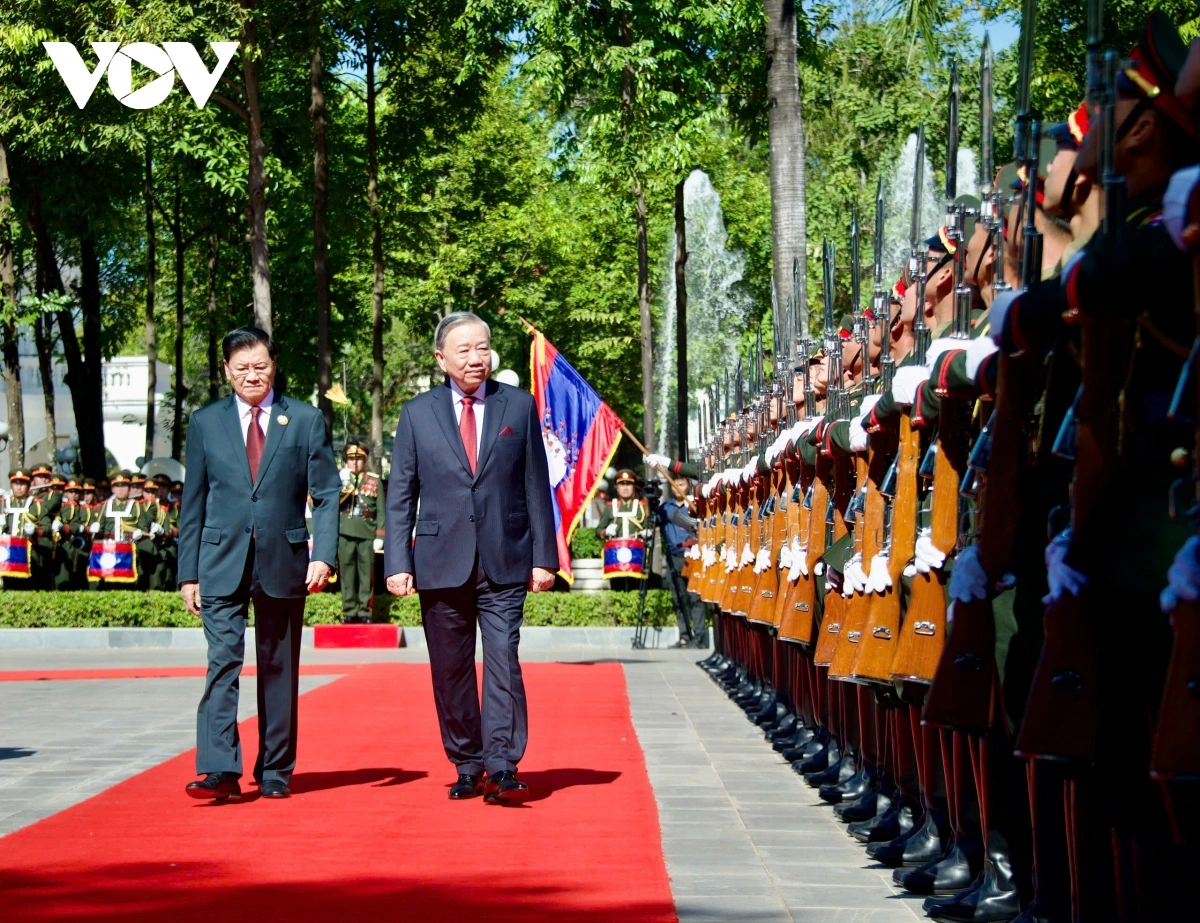 Tổng Bí thư, Chủ tịch Lào Thongloun Sisoulith mời Tổng Bí thư Tô Lâm duyệt đội danh dự và hai nhà lãnh đạo giới thiệu các quan chức hai bên có mặt tại lễ đón.